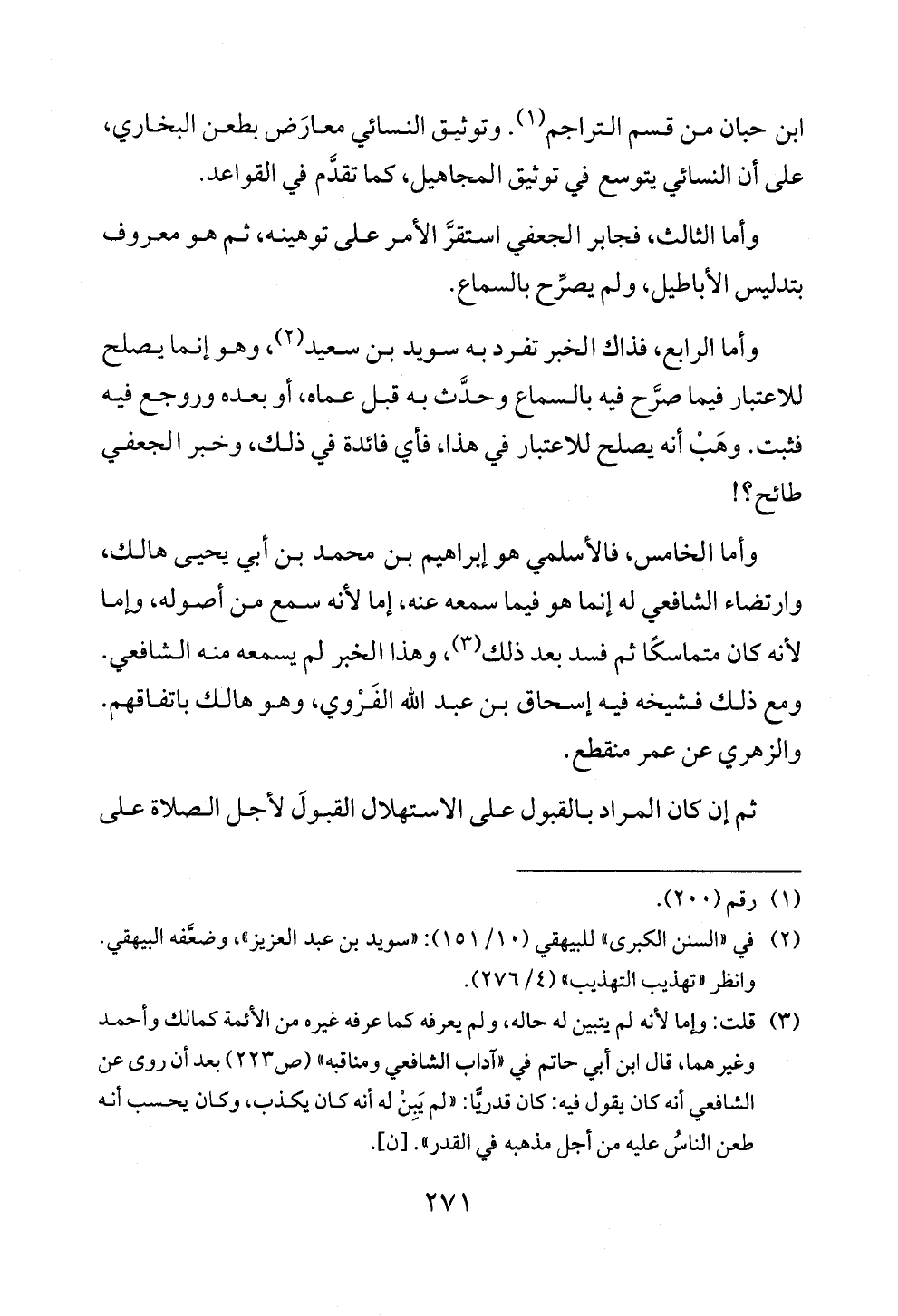 (¬٣) قلت: وإما لأنه لم يتبين له حاله، ولم يعرفه كما عرفه غيره من الأئمة كمالك وأحمد وغيرهما، قال ابن أبي حاتم في «آداب الشافعي ومناقبه» (ص ٢٢٣) بعد أن روى عن الشافعي أنه كان يقول فيه: كان قدريًّا: «لم يَبِنْ له أنه كان يكذب، وكان يحسب أنه طعن الناسُ عليه من أجل مذهبه في القدر». [ن].