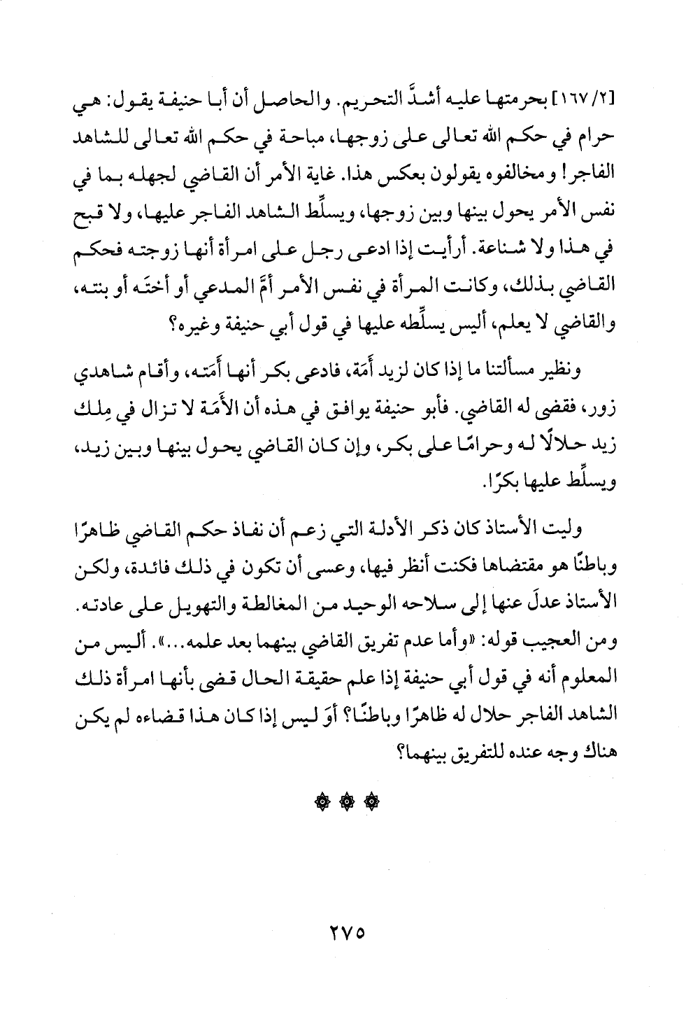 وليت الأستاذ كان ذكر الأدلة التي زعم أن نفاذ حكم القاضي ظاهرًا وباطنًا هو مقتضاها فكنت أنظر فيها، وعسى أن تكون في ذلك فائدة، ولكن الأستاذ عدلَ عنها إلى سلاحه الوحيد من المغالطة والتهويل على عادته. ومن العجيب قوله: «وأما عدم تفريق القاضي بينهما بعد علمه ... ». أليس من المعلوم أنه في قول أبي حنيفة إذا علم حقيقة الحال قضى بأنها امرأة ذلك الشاهد الفاجر حلال له ظاهرًا وباطنًا؟ أوَ ليس إذا كان هذا قضاءه لم يكن هناك وجه عنده للتفريق بينهما؟
