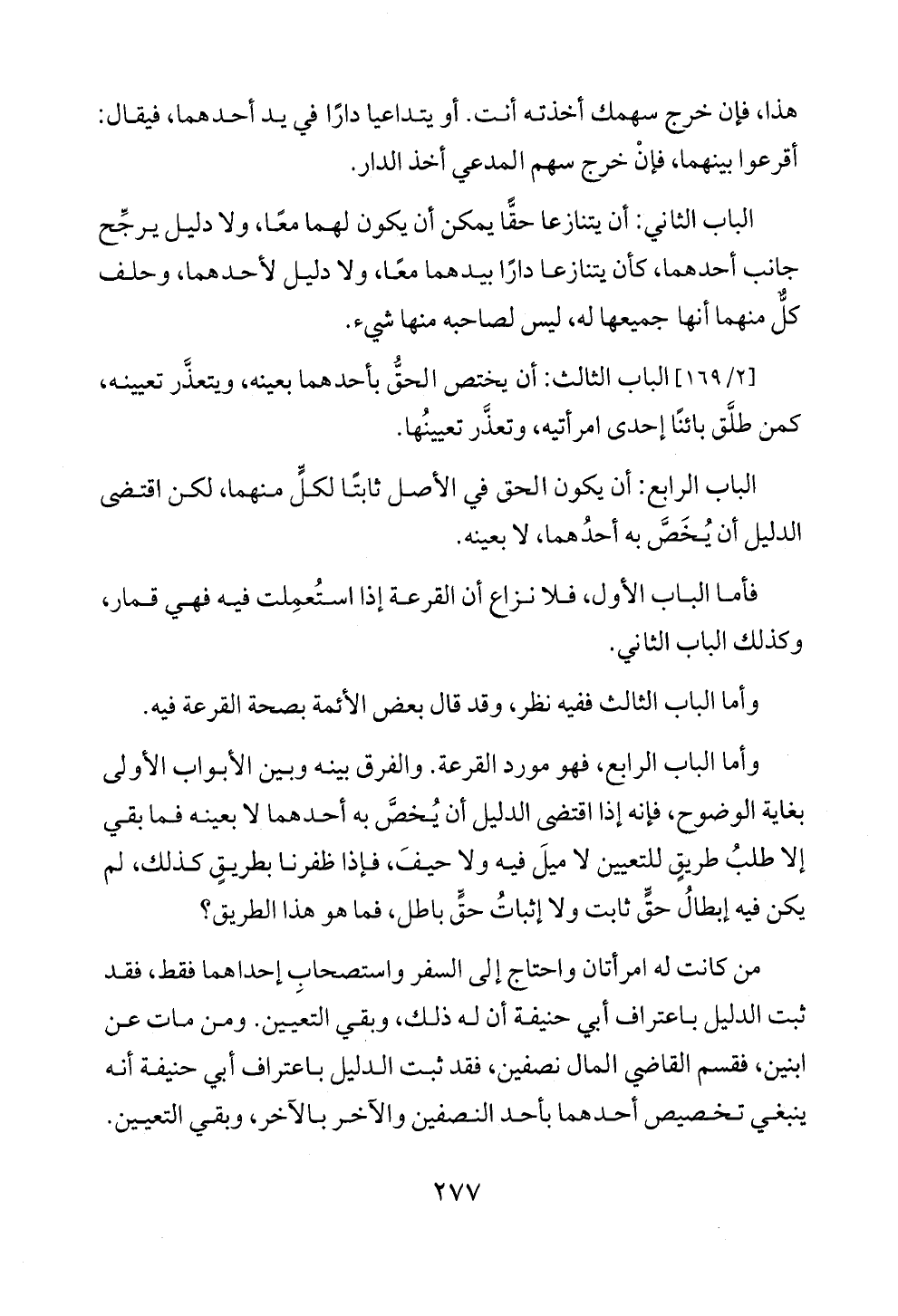 وأما الباب الرابع، فهو مورد القرعة. والفرق بينه وبين الأبواب الأولى بغاية الوضوح، فإنه إذا اقتضى الدليل أن يُخصَّ به أحدهما لا بعينه فما بقي إلا طلبُ طريقٍ للتعيين لا ميلَ فيه ولا حيفَ، فإذا ظفرنا بطريقٍ كذلك، لم يكن فيه إبطالُ حقٍّ ثابت ولا إثباتُ حقٍّ باطل، فما هو هذا الطريق؟
