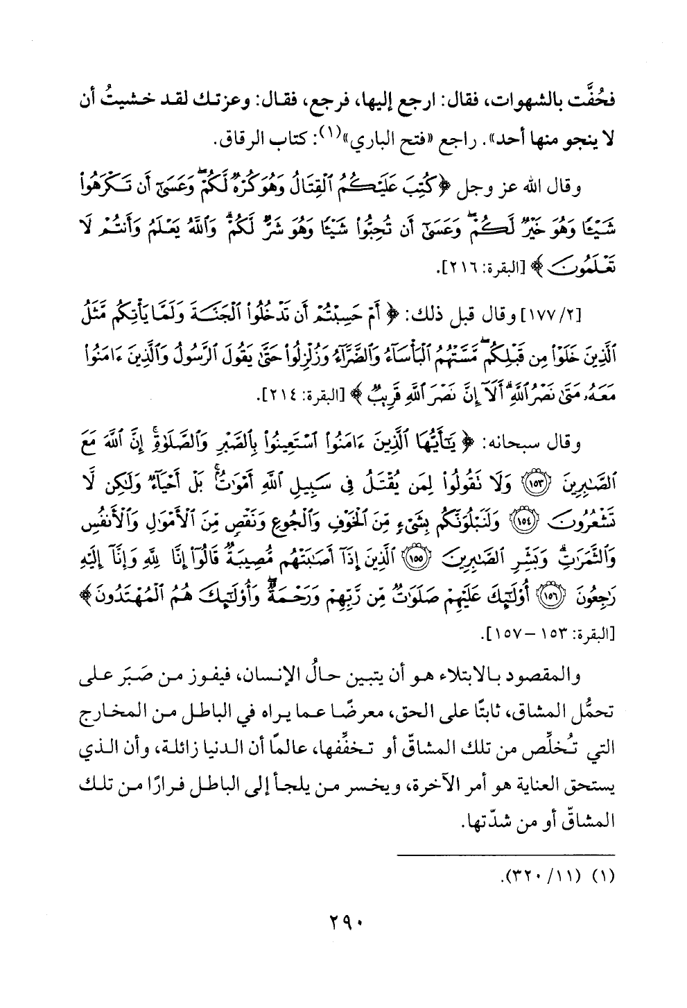 وقال سبحانه: {يَاأَيُّهَا الَّذِينَ آمَنُوا اسْتَعِينُوا بِالصَّبْرِ وَالصَّلَاةِ إِنَّ اللَّهَ مَعَ الصَّابِرِينَ (١٥٣) وَلَا تَقُولُوا لِمَنْ يُقْتَلُ فِي سَبِيلِ اللَّهِ أَمْوَاتٌ بَلْ أَحْيَاءٌ وَلَكِنْ لَا تَشْعُرُونَ (١٥٤) وَلَنَبْلُوَنَّكُمْ بِشَيْءٍ مِنَ الْخَوْفِ وَالْجُوعِ وَنَقْصٍ مِنَ الْأَمْوَالِ وَالْأَنْفُسِ وَالثَّمَرَاتِ وَبَشِّرِ الصَّابِرِينَ (١٥٥) الَّذِينَ إِذَا أَصَابَتْهُمْ مُصِيبَةٌ قَالُوا إِنَّا لِلَّهِ وَإِنَّا إِلَيْهِ رَاجِعُونَ (١٥٦) أُولَئِكَ عَلَيْهِمْ صَلَوَاتٌ مِنْ رَبِّهِمْ وَرَحْمَةٌ وَأُولَئِكَ هُمُ الْمُهْتَدُونَ} [البقرة: ١٥٣ - ١٥٧].