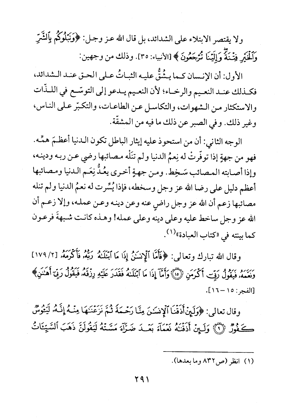 وقال الله تبارك وتعالى: {فَأَمَّا الْإِنْسَانُ إِذَا مَا ابْتَلَاهُ رَبُّهُ فَأَكْرَمَهُ [٢/ ١٧٩] وَنَعَّمَهُ فَيَقُولُ رَبِّي أَكْرَمَنِ (١٥) وَأَمَّا إِذَا مَا ابْتَلَاهُ فَقَدَرَ عَلَيْهِ رِزْقَهُ فَيَقُولُ رَبِّي أَهَانَنِ} [الفجر: ١٥ - ١٦].