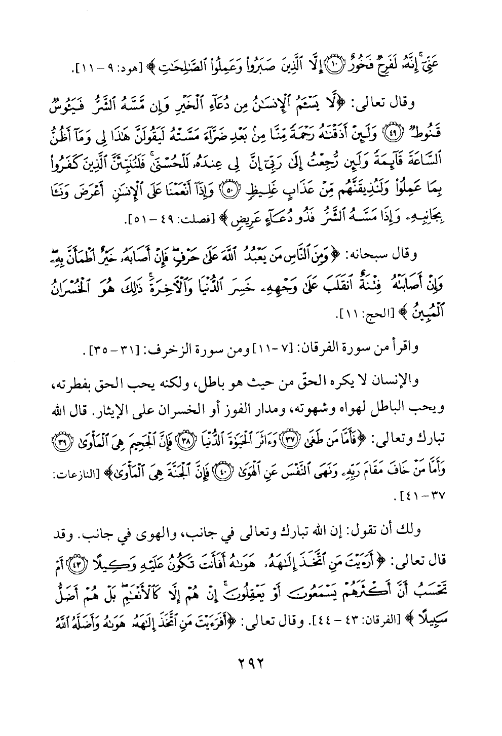 وقال سبحانه: {وَمِنَ النَّاسِ مَنْ يَعْبُدُ اللَّهَ عَلَى حَرْفٍ فَإِنْ أَصَابَهُ خَيْرٌ اطْمَأَنَّ بِهِ وَإِنْ أَصَابَتْهُ فِتْنَةٌ انْقَلَبَ عَلَى وَجْهِهِ خَسِرَ الدُّنْيَا وَالْآخِرَةَ ذَلِكَ هُوَ الْخُسْرَانُ الْمُبِينُ} [الحج: ١١].