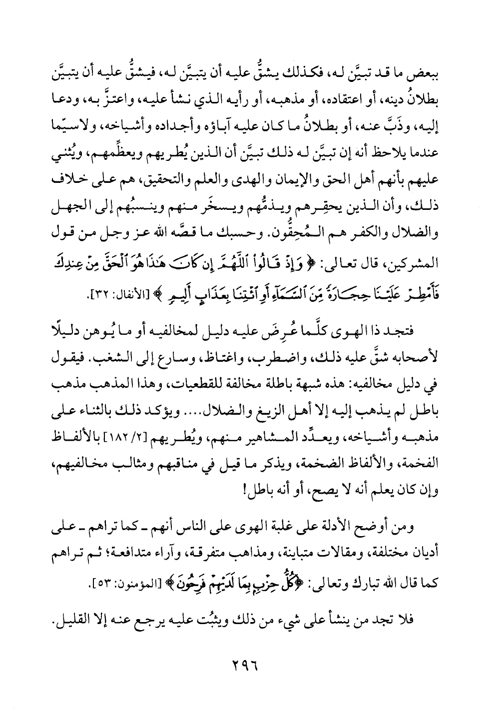 ومن أوضح الأدلة على غلبة الهوى على الناس أنهم ــ كما تراهم ــ على أديان مختلفة، ومقالات متباينة، ومذاهب متفرقة، وآراء متدافعة؛ ثم تراهم كما قال الله تبارك وتعالى: {كُلُّ حِزْبٍ بِمَا لَدَيْهِمْ فَرِحُونَ} [المؤمنون: ٥٣].