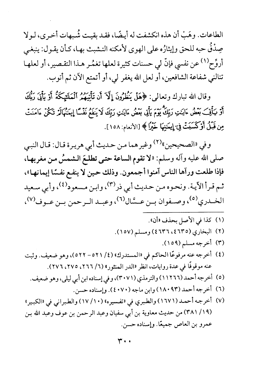وفي "الصحيحين" (¬٢) وغيرهما من حديث أبي هريرة قال: قال النبي صلى الله عليه وآله وسلم: "لا تقوم الساعة حتى تطلعَ الشمسُ من مغربها، فإذا طلعت ورآها الناس آمنوا أجمعون. وذلك حين لا ينفع نفسًا إيمانها"، ثم قرأ الآية. ونحوه من حديث أبي ذر (¬٣)، وابن مسعود (¬٤)، وأبي سعيد الخدري (¬٥)، وصفوان بن عسَّال (¬٦)، وعبد الرحمن بن عوف (¬٧)،