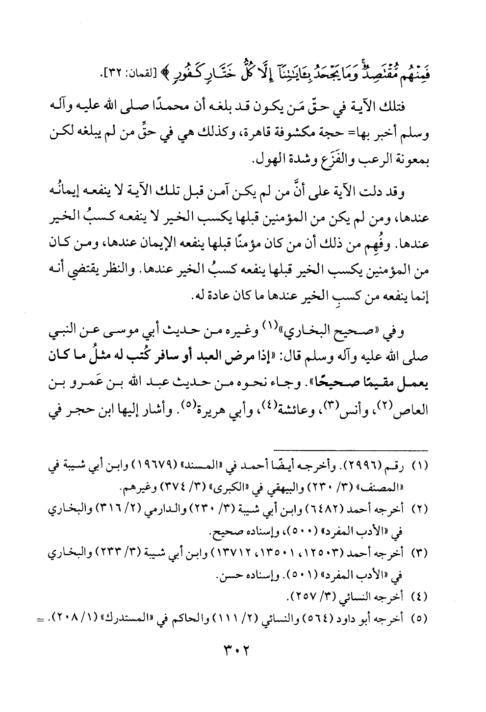 وقد دلت الآية على أنَّ من لم يكن آمن قبل تلك الآية لا ينفعه إيمانُه عندها، ومن لم يكن من المؤمنين قبلها يكسب الخير لا ينفعه كسبُ الخير عندها. وفُهِم من ذلك أن من كان مؤمنًا قبلها ينفعه الإيمان عندها، ومن كان من المؤمنين يكسب الخير قبلها ينفعه كسبُ الخير عندها. والنظر يقتضي أنه إنما ينفعه من كسبِ الخير عندها ما كان عادة له.