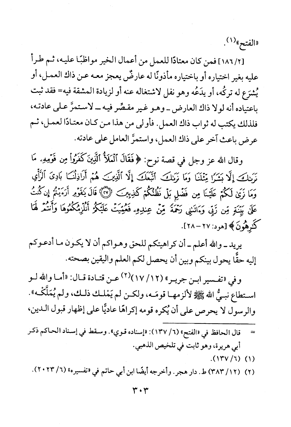 [٢/ ١٨٦] فمن كان معتادًا للعمل من أعمال الخير مواظبًا عليه، ثم طرأ عليه بغير اختياره أو باختياره مأذونًا له عارضٌ يعجز معه عن ذاك العمل، أو يُشرَع له تركُه، أو يدَعُه وهو نفل لاشتغاله عنه أو لزيادة المشقة فيه= فقد ثبت باعتياده أنه لولا ذاك العارض ــ وهو غير مقصِّر فيه ــ لاستمرَّ على عادته، فلذلك يكتب له ثواب ذاك العمل. فأولى من هذا من كان معتادًا لعمل، ثم عرض باعث آخر على ذاك العمل، واستمرَّ العامل على عادته.