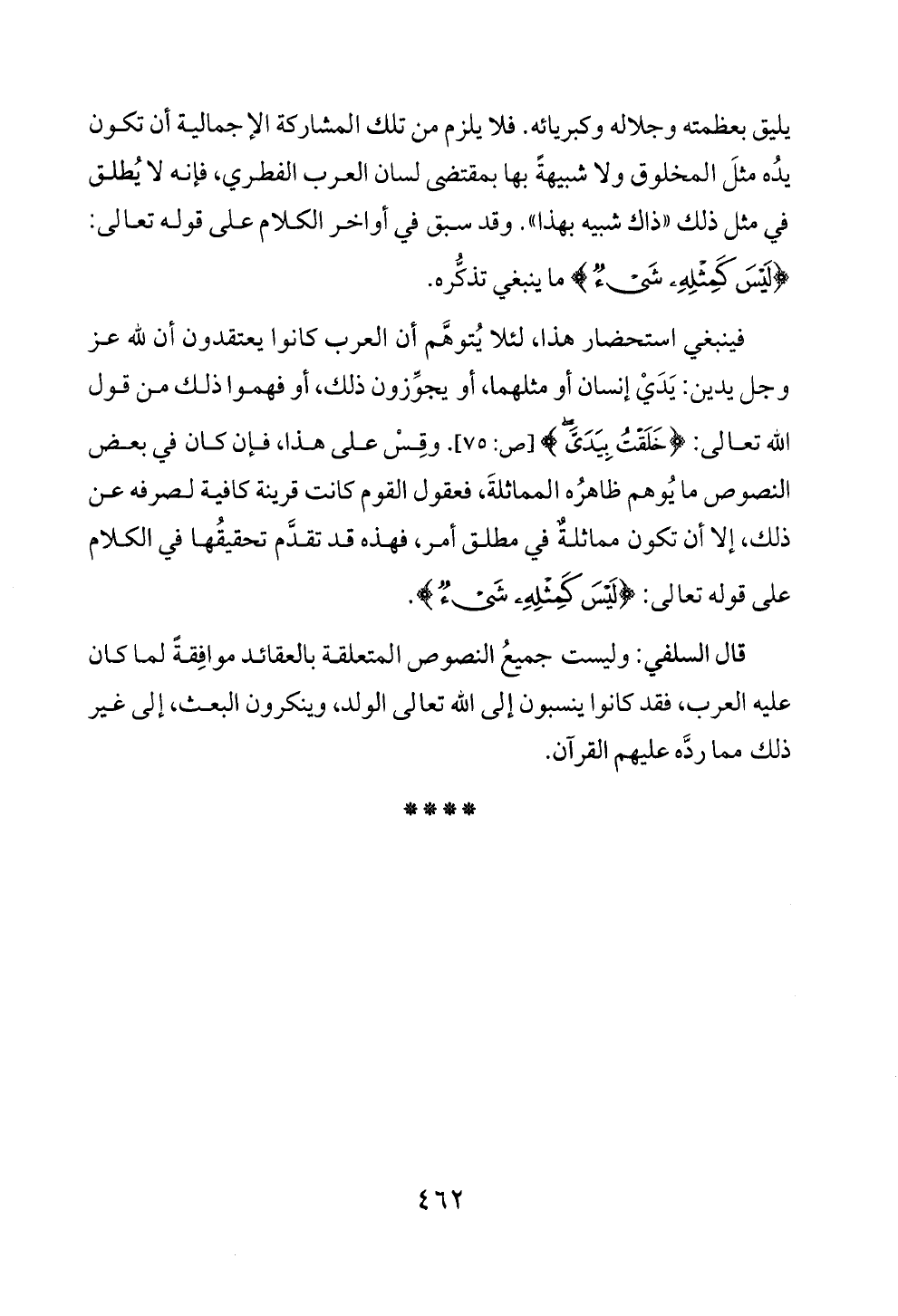 فينبغي استحضار هذا، لئلا يُتوهَّم أن العرب كانوا يعتقدون أن لله عز وجل يدين: يَدَيْ إنسان أو مثلهما، أو يجوِّزون ذلك، أو فهموا ذلك من قول الله تعالى: {خَلَقْتُ بِيَدَيَّ} [ص: ٧٥]. وقِسْ على هذا، فإن كان في بعض النصوص ما يُوهم ظاهرُه المماثلةَ، فعقول القوم كانت قرينة كافية لصرفه عن ذلك، إلا أن تكون مماثلةٌ في مطلق أمر، فهذه قد تقدَّم تحقيقُها في الكلام على قوله تعالى: {لَيْسَ كَمِثْلِهِ شَيْءٌ}.