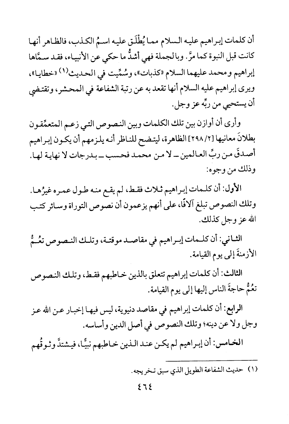 وأرى أن أوازن بين تلك الكلمات وبين النصوص التي زعم المتعمِّقون بطلانَ معانيها [٢/ ٢٩٨] الظاهرة، ليتضح للناظر أنه يلزمهم أن يكون إبراهيم أصدقَ من ربِّ العالمين ــ لا من محمد فحسب ــ بدرجات لا نهاية لها. وذلك من وجوه: