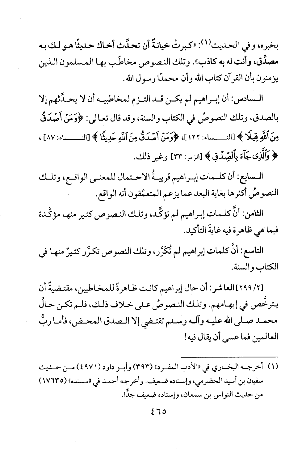 التاسع: أنَّ كلمات إبراهيم لم تُكَرَّر، وتلك النصوص تكرَّر كثيرٌ منها في الكتاب والسنة.
