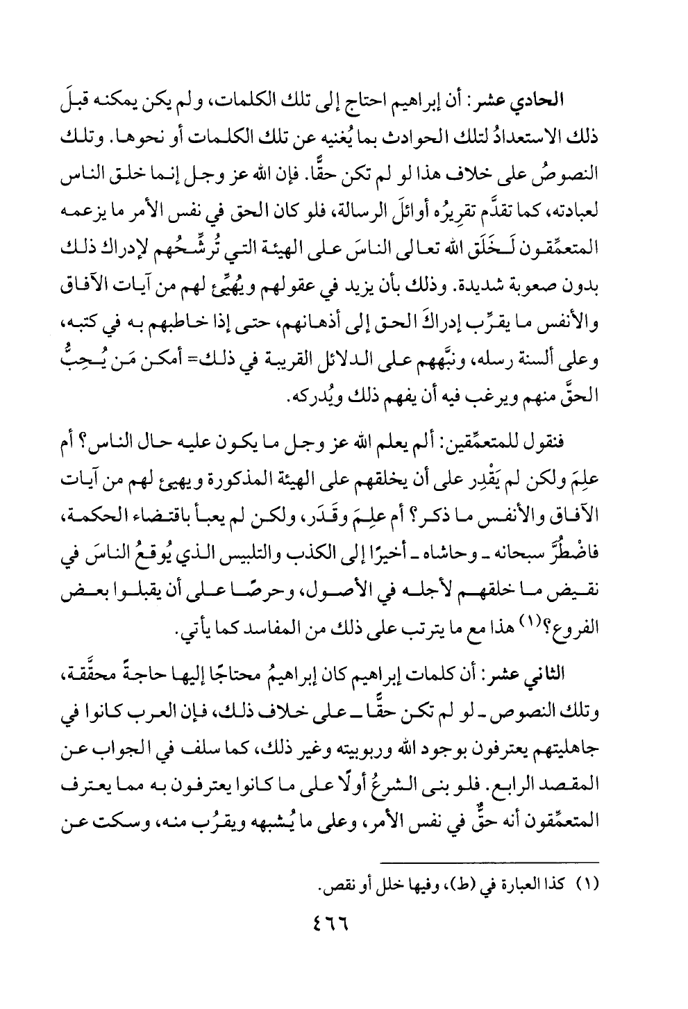 الحادي عشر: أن إبراهيم احتاج إلى تلك الكلمات، ولم يكن يمكنه قبلَ ذلك الاستعدادُ لتلك الحوادث بما يُغنيه عن تلك الكلمات أو نحوها. وتلك النصوصُ على خلاف هذا لو لم تكن حقًّا. فإن الله عز وجل إنما خلق الناس لعبادته، كما تقدَّم تقرِيرُه أوائلَ الرسالة، فلو كان الحق في نفس الأمر ما يزعمه المتعمِّقون لَخَلَق الله تعالى الناسَ على الهيئة التي تُرشِّحُهم لإدراك ذلك بدون صعوبة شديدة. وذلك بأن يزيد في عقولهم ويُهيِّئ لهم من آيات الآفاق والأنفس ما يقرِّب إدراكَ الحق إلى أذهانهم، حتى إذا خاطبهم به في كتبه، وعلى ألسنة رسله، ونبَّههم على الدلائل القريبة في ذلك= أمكن مَن يُحِبُّ الحقَّ منهم ويرغب فيه أن يفهم ذلك ويُدركه.