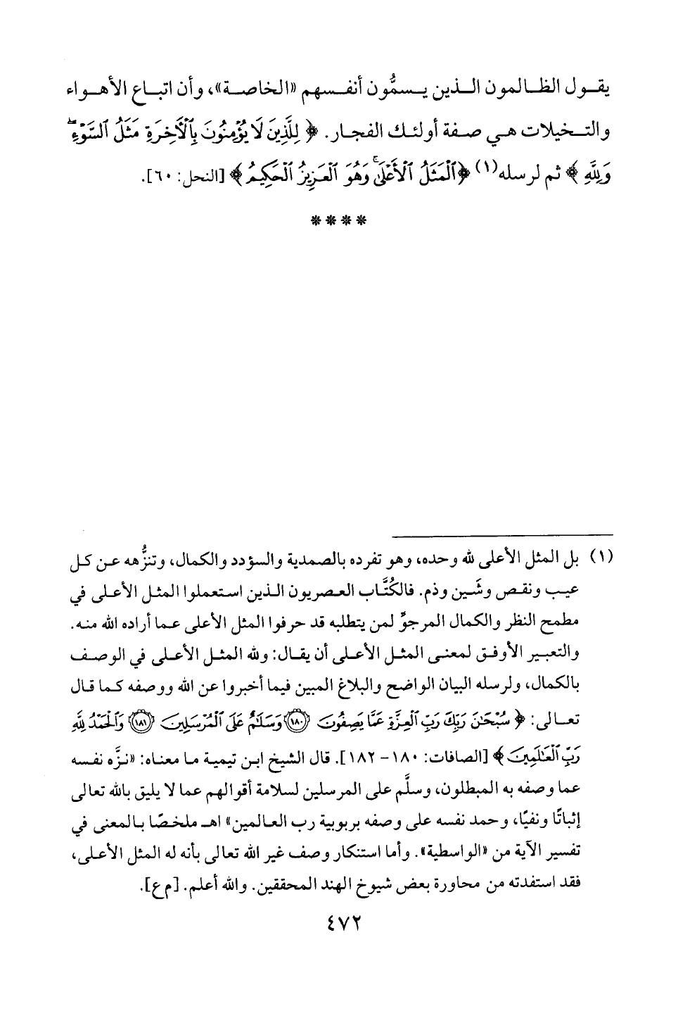(¬١) بل المثل الأعلى لله وحده، وهو تفرده بالصمدية والسؤدد والكمال، وتنزُّهه عن كل عيب ونقص وشَين وذم. فالكُتَّاب العصريون الذين استعملوا المثل الأعلى في مطمح النظر والكمال المرجوِّ لمن يتطلبه قد حرفوا المثل الأعلى عما أراده الله منه. والتعبير الأوفق لمعنى المثل الأعلى أن يقال: ولله المثل الأعلى في الوصف بالكمال، ولرسله البيان الواضح والبلاغ المبين فيما أخبروا عن الله ووصفه كما قال تعالى: {سُبْحَانَ رَبِّكَ رَبِّ الْعِزَّةِ عَمَّا يَصِفُونَ (١٨٠) وَسَلَامٌ عَلَى الْمُرْسَلِينَ (١٨١) وَالْحَمْدُ لِلَّهِ رَبِّ الْعَالَمِينَ} [الصافات: ١٨٠ - ١٨٢]. قال الشيخ ابن تيمية ما معناه: «نزَّه نفسه عما وصفه به المبطلون، وسلَّم على المرسلين لسلامة أقوالهم عما لا يليق بالله تعالى إثباتًا ونفيًا، وحمد نفسه على وصفه بربوبية رب العالمين» اهـ ملخصًا بالمعنى في تفسير الآية من «الواسطية». وأما استنكار وصف غير الله تعالى بأنه له المثل الأعلى، فقد استفدته من محاورة بعض شيوخ الهند المحققين. والله أعلم. [م ع].