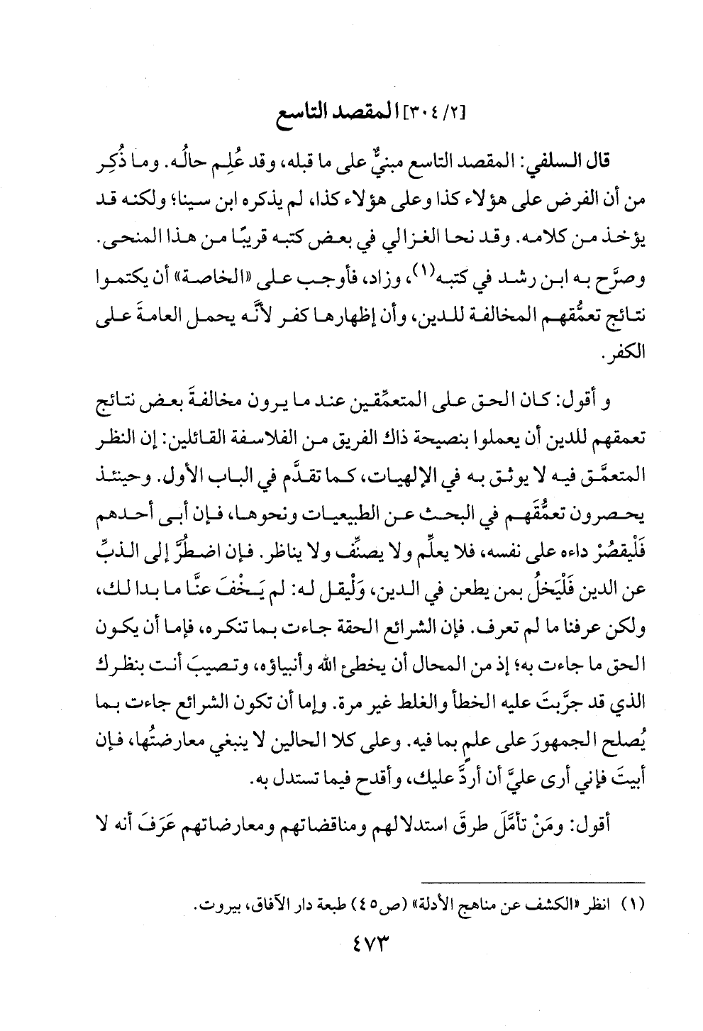 قال السلفي: المقصد التاسع مبنيٌّ على ما قبله، وقد عُلِم حالُه. وما ذُكِر من أن الفرض على هؤلاء كذا وعلى هؤلاء كذا، لم يذكره ابن سينا؛ ولكنه قد يؤخذ من كلامه. وقد نحا الغزالي في بعض كتبه قريبًا من هذا المنحى. وصرَّح به ابن رشد في كتبه (¬١)، وزاد، فأوجب على «الخاصة» أن يكتموا نتائج تعمُّقهم المخالفة للدين، وأن إظهارها كفر لأنَّه يحمل العامةَ على الكفر.