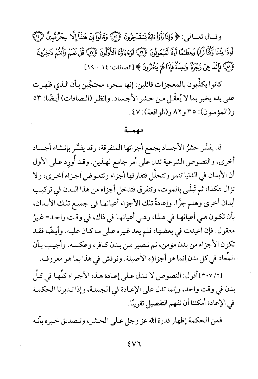 [٢/ ٣٠٧] أقول: النصوص لا تدل على إعادة هذه الأجزاء كلِّها في كلِّ بدن في وقت واحد، وإنما تدل على الإعادة في الجملة، وإذا تدبرنا الحكمة في الإعادة أمكننا أن نفهم التفصيل تقريبًا.