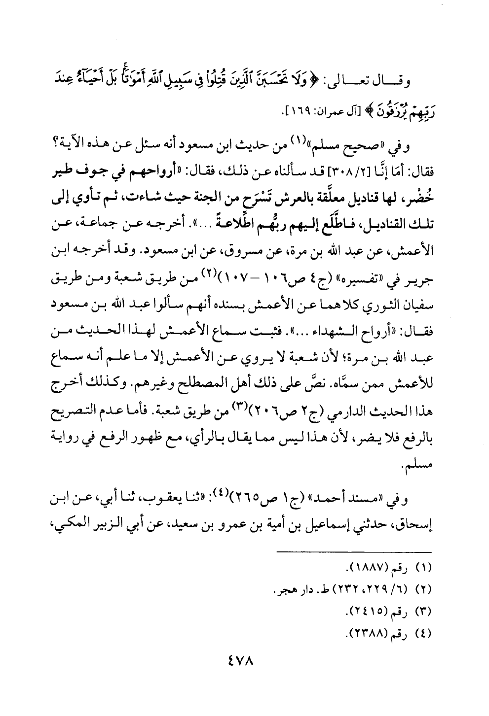 وفي «صحيح مسلم» (¬١) من حديث ابن مسعود أنه سئل عن هذه الآية؟ فقال: أمَا إنَّا [٢/ ٣٠٨] قد سألناه عن ذلك، فقال: «أرواحهم في جوف طير خُضْر، لها قناديل معلَّقة بالعرش تَسْرَح من الجنة حيث شاءت، ثم تأوي إلى تلك القناديل، فاطَّلَع إليهم ربُّهم اطِّلاعةً ... ». أخرجه عن جماعة، عن الأعمش، عن عبد الله بن مرة، عن مسروق، عن ابن مسعود. وقد أخرجه ابن جرير في «تفسيره» (ج ٤ ص ١٠٦ - ١٠٧) (¬٢) من طريق شعبة ومن طريق سفيان الثوري كلاهما عن الأعمش بسنده أنهم سألوا عبد الله بن مسعود فقال: «أرواح الشهداء ... ». فثبت سماع الأعمش لهذا الحديث من عبد الله بن مرة؛ لأن شعبة لا يروي عن الأعمش إلا ما علم أنه سماع للأعمش ممن سمَّاه. نصَّ على ذلك أهل المصطلح وغيرهم. وكذلك أخرج هذا الحديث الدارمي (ج ٢ ص ٢٠٦) (¬٣) من طريق شعبة. فأما عدم التصريح بالرفع فلا يضر، لأن هذا ليس مما يقال بالرأي، مع ظهور الرفع في رواية مسلم.