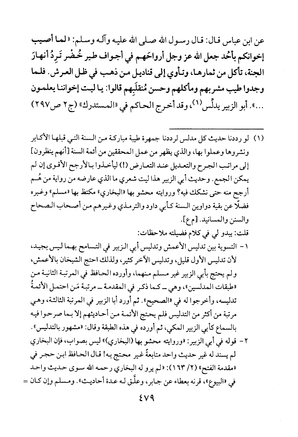 عن ابن عباس قال: قال رسول الله صلى الله عليه وآله وسلم: «لما أصيب إخوانكم بأحُد جعل الله عز وجل أرواحَهم في أجواف طير خُضْر تَرِدُ أنهارَ الجنة، تأكل من ثمارها، وتأوي إلى قناديل من ذهب في ظل العرش. فلما وجدوا طيب مشربهم ومأكلهم وحسن مُنقلَبِهم قالوا: يا ليت إخواننا يعلمون ... ». أبو الزبير يدلِّس (¬١)،