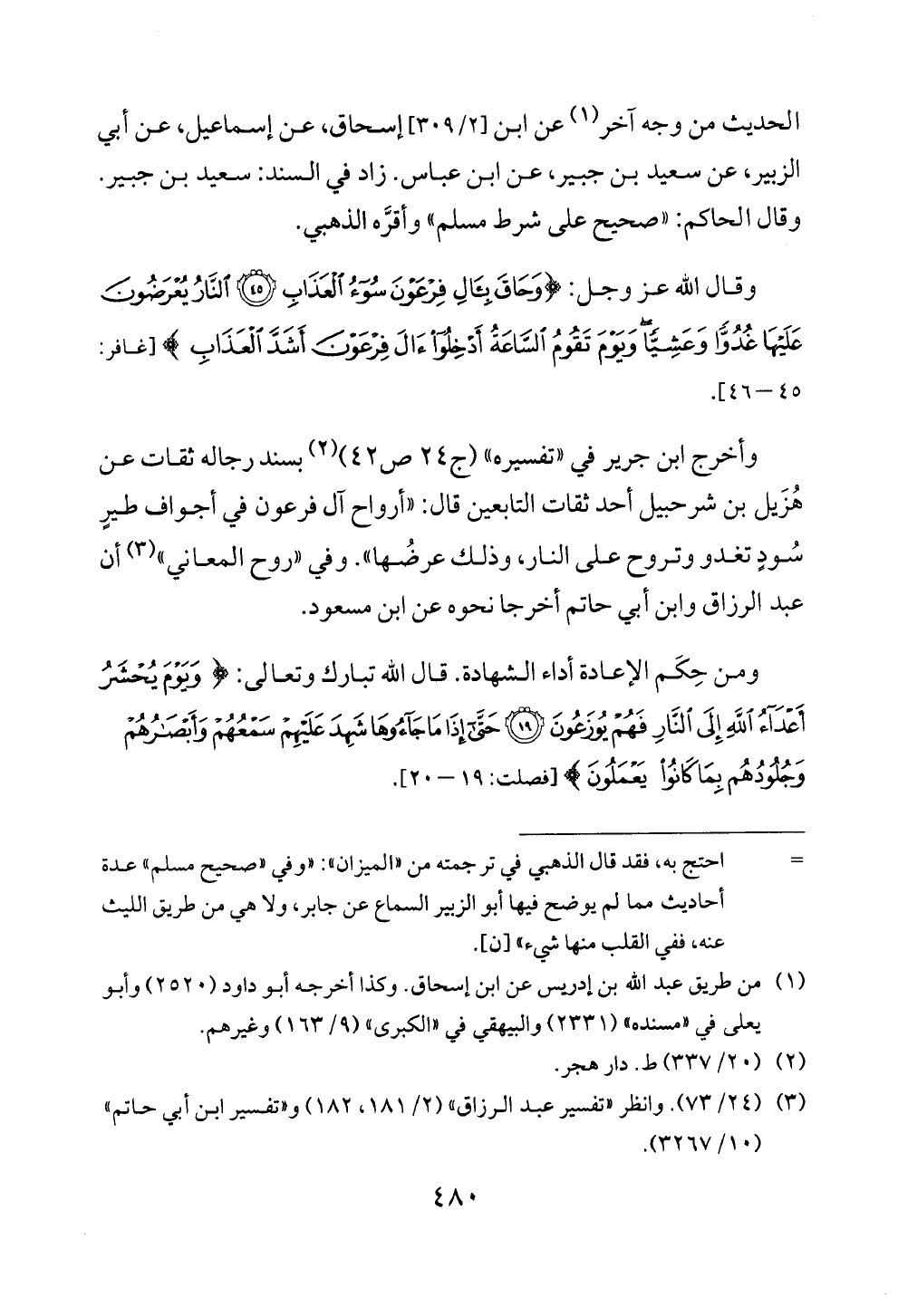 وأخرج ابن جرير في «تفسيره» (ج ٢٤ ص ٤٢) (¬٢) بسند رجاله ثقات عن هُزَيل بن شرحبيل أحد ثقات التابعين قال: «أرواح آل فرعون في أجواف طيرٍ سُودٍ تغدو وتروح على النار، وذلك عرضُها». وفي «روح المعاني» (¬٣) أن عبد الرزاق وابن أبي حاتم أخرجا نحوه عن ابن مسعود.