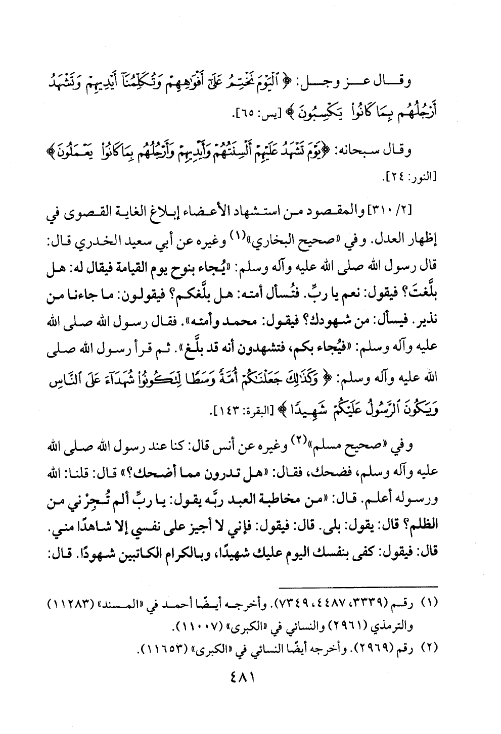[٢/ ٣١٠] والمقصود من استشهاد الأعضاء إبلاغ الغاية القصوى في إظهار العدل. وفي «صحيح البخاري» (¬١) وغيره عن أبي سعيد الخدري قال: قال رسول الله صلى الله عليه وآله وسلم: «يُجاء بنوح يوم القيامة فيقال له: هل بلَّغتَ؟ فيقول: نعم يا ربِّ. فتُسأل أمته: هل بلَّغكم؟ فيقولون: ما جاءنا من نذير. فيسأل: من شهودك؟ فيقول: محمد وأمته». فقال رسول الله صلى الله عليه وآله وسلم: «فيُجاء بكم، فتشهدون أنه قد بلَّغ». ثم قرأ رسول الله صلى الله عليه وآله وسلم: {وَكَذَلِكَ جَعَلْنَاكُمْ أُمَّةً وَسَطًا لِتَكُونُوا شُهَدَاءَ عَلَى النَّاسِ وَيَكُونَ الرَّسُولُ عَلَيْكُمْ شَهِيدًا} [البقرة: ١٤٣].