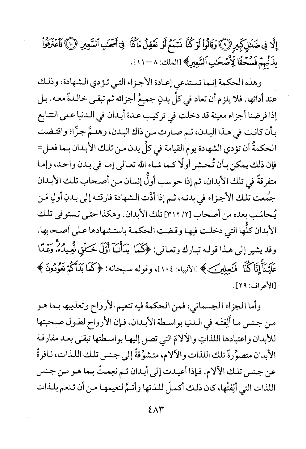 وهذه الحكمة إنما تستدعي إعادة الأجزاء التي تؤدي الشهادة، وذلك عند أدائها. فلا يلزم أن تعاد في كلِّ بدنٍ جميعُ أجزائه ثم تبقى خالدةً معه. بل إذا فرضنا أجزاء معينة قد دخلت في تركيب عدة أبدان في الدنيا على التتابع بأن كانت في هذا البدن، ثم صارت من ذاك البدن، وهلمَّ جرًّا؛ واقتضت الحكمةُ أن تؤدي الشهادة يوم القيامة في كلِّ بدن من تلك الأبدان بما فعل= فإن ذلك يمكن بأن تُحشر أولًا كما شاء الله تعالى إما في بدن واحد، وإما متفرقةً في تلك الأبدان، ثم إذا حوسب أولُّ إنسان من أصحاب تلك الأبدان جُمعت تلك الأجزاء في بدنه، ثم إذا أدَّت الشهادة فارقته إلى بدنِ أولِ مَن يُحاسَب بعده من أصحاب [٢/ ٣١٢] تلك الأبدان. وهكذا حتى تستوفى تلك الأبدان كلُّها التي دخلت فيها وقضت الحكمة باستشهادها على أصحابها. وقد يشير إلى هذا قوله تبارك وتعالى: {كَمَا بَدَأْنَا أَوَّلَ خَلْقٍ نُعِيدُهُ وَعْدًا عَلَيْنَا إِنَّا كُنَّا فَاعِلِينَ} [الأنبياء: ١٠٤]، وقوله سبحانه: {كَمَا بَدَأَكُمْ تَعُودُونَ} [الأعراف: ٢٩].