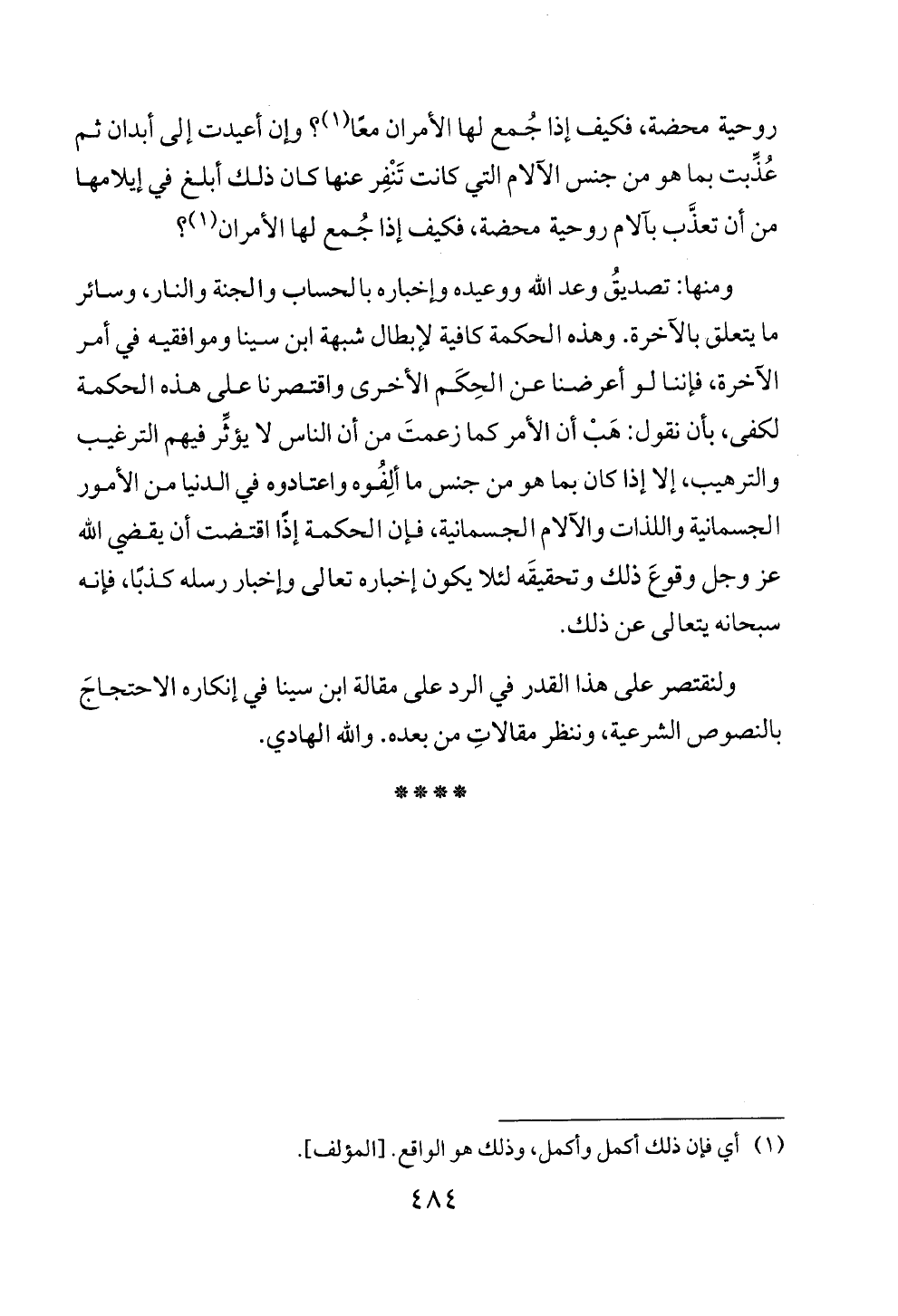 ومنها: تصديقُ وعد الله ووعيده وإخباره بالحساب والجنة والنار، وسائر ما يتعلق بالآخرة. وهذه الحكمة كافية لإبطال شبهة ابن سينا وموافقيه في أمر الآخرة، فإننا لو أعرضنا عن الحِكَم الأخرى واقتصرنا على هذه الحكمة لكفى، بأن نقول: هَبْ أن الأمر كما زعمتَ من أن الناس لا يؤثِّر فيهم الترغيب والترهيب، إلا إذا كان بما هو من جنس ما ألِفُوه واعتادوه في الدنيا من الأمور الجسمانية واللذات والآلام الجسمانية، فإن الحكمة إذًا اقتضت أن يقضي الله عز وجل وقوعَ ذلك وتحقيقَه لئلا يكون إخباره تعالى وإخبار رسله كذبًا، فإنه سبحانه يتعالى عن ذلك.