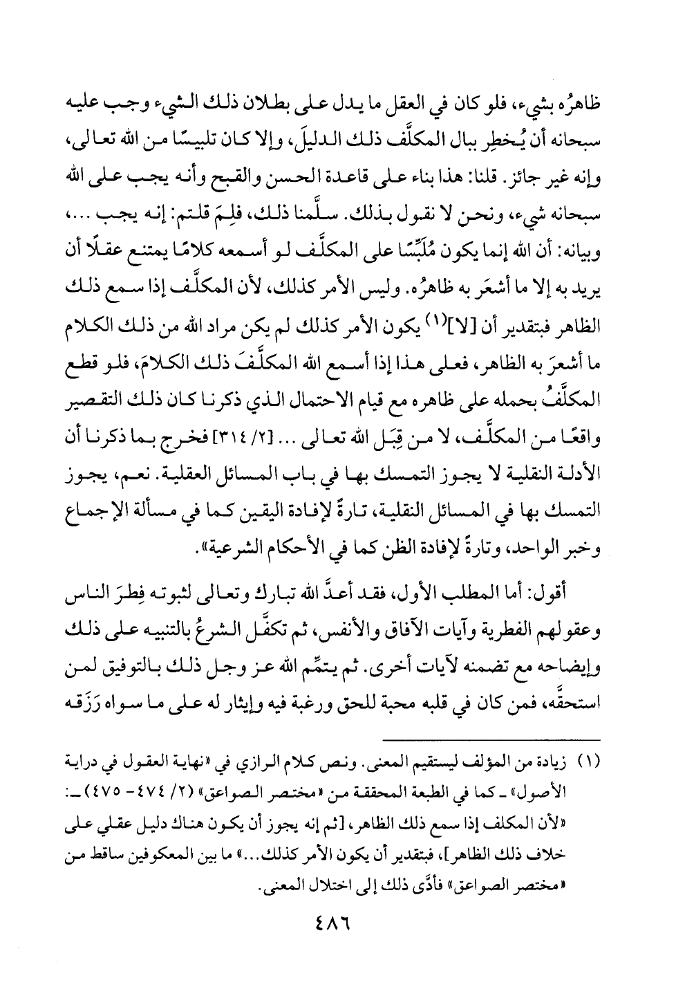 ظاهرُه بشيء، فلو كان في العقل ما يدل على بطلان ذلك الشيء وجب عليه سبحانه أن يُخطِر ببال المكلَّف ذلك الدليلَ، وإلا كان تلبيسًا من الله تعالى، وإنه غير جائز. قلنا: هذا بناء على قاعدة الحسن والقبح وأنه يجب على الله سبحانه شيء، ونحن لا نقول بذلك. سلَّمنا ذلك، فلِمَ قلتم: إنه يجب ... ، وبيانه: أن الله إنما يكون مُلَبِّسًا على المكلَّف لو أسمعه كلامًا يمتنع عقلًا أن يريد به إلا ما أشعَر به ظاهرُه. وليس الأمر كذلك، لأن المكلَّف إذا سمع ذلك الظاهر فبتقدير أن [لا] (¬١) يكون الأمر كذلك لم يكن مراد الله من ذلك الكلام ما أشعرَ به الظاهر، فعلى هذا إذا أسمع الله المكلَّفَ ذلك الكلامَ، فلو قطع المكلَّفُ بحمله على ظاهره مع قيام الاحتمال الذي ذكرنا كان ذلك التقصير واقعًا من المكلَّف، لا من قِبَل الله تعالى ... [٢/ ٣١٤] فخرج بما ذكرنا أن الأدلة النقلية لا يجوز التمسك بها في باب المسائل العقلية. نعم، يجوز التمسك بها في المسائل النقلية، تارةً لإفادة اليقين كما في مسألة الإجماع وخبر الواحد، وتارةً لإفادة الظن كما في الأحكام الشرعية».