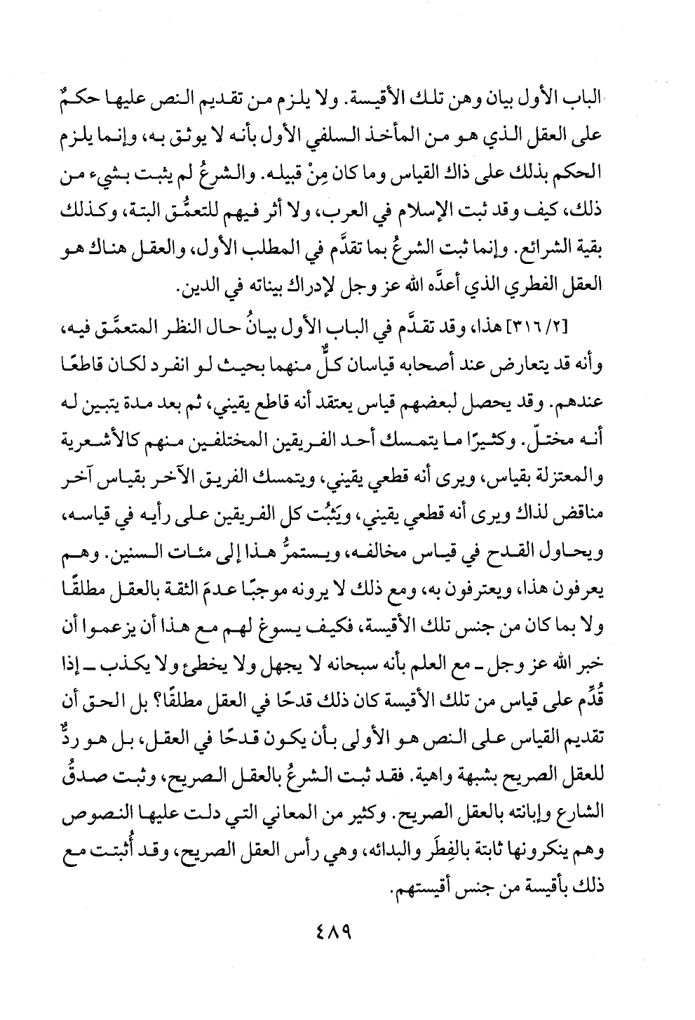 [٢/ ٣١٦] هذا، وقد تقدَّم في الباب الأول بيانُ حال النظر المتعمَّق فيه، وأنه قد يتعارض عند أصحابه قياسان كلٌّ منهما بحيث لو انفرد لكان قاطعًا عندهم. وقد يحصل لبعضهم قياس يعتقد أنه قاطع يقيني، ثم بعد مدة يتبين له أنه مختلّ. وكثيرًا ما يتمسك أحد الفريقين المختلفين منهم كالأشعرية والمعتزلة بقياس، ويرى أنه قطعي يقيني، ويتمسك الفريق الآخر بقياس آخر مناقض لذاك ويرى أنه قطعي يقيني، ويَثبُت كل الفريقين على رأيه في قياسه، ويحاول القدح في قياس مخالفه، ويستمرُّ هذا إلى مئات السنين. وهم يعرفون هذا، ويعترفون به، ومع ذلك لا يرونه موجبًا عدمَ الثقة بالعقل مطلقًا ولا بما كان من جنس تلك الأقيسة، فكيف يسوغ لهم مع هذا أن يزعموا أن خبر الله عز وجل ــ مع العلم بأنه سبحانه لا يجهل ولا يخطئ ولا يكذب ــ إذا قُدِّم على قياس من تلك الأقيسة كان ذلك قدحًا في العقل مطلقًا؟ بل الحق أن تقديم القياس على النص هو الأولى بأن يكون قدحًا في العقل، بل هو ردٌّ للعقل الصريح بشبهة واهية. فقد ثبت الشرعُ بالعقل الصريح، وثبت صدقُ الشارع وإبانته بالعقل الصريح. وكثير من المعاني التي دلت عليها النصوص وهم ينكرونها ثابتة بالفِطَر والبدائه، وهي رأس العقل الصريح، وقد أُثبتت مع ذلك بأقيسة من جنس أقيستهم.