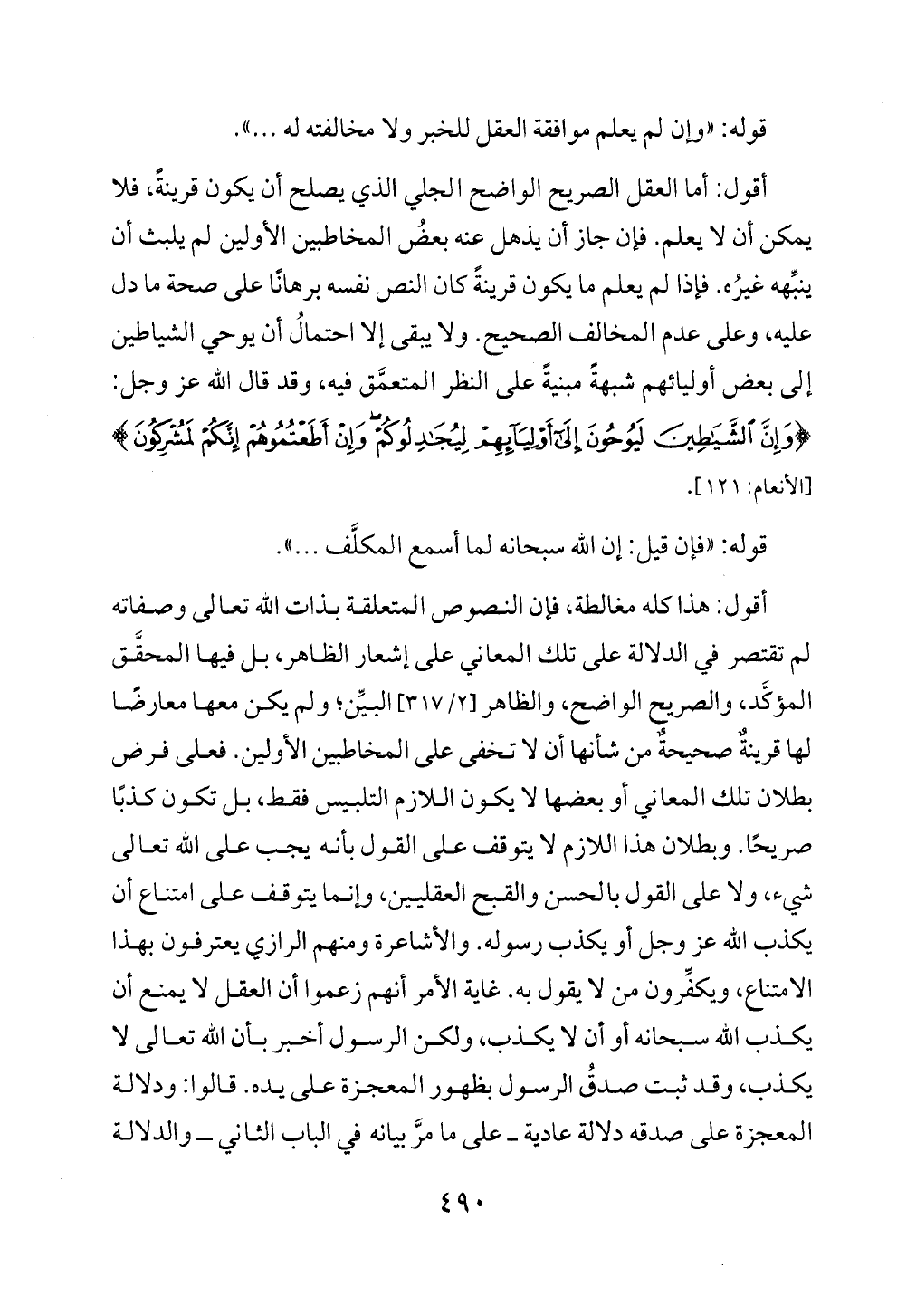 أقول: هذا كله مغالطة، فإن النصوص المتعلقة بذات الله تعالى وصفاته لم تقتصر في الدلالة على تلك المعاني على إشعار الظاهر، بل فيها المحقَّق المؤكَّد، والصريح الواضح، والظاهر [٢/ ٣١٧] البيِّن؛ ولم يكن معها معارضًا لها قرينةٌ صحيحةٌ من شأنها أن لا تخفى على المخاطبين الأولين. فعلى فرض بطلان تلك المعاني أو بعضها لا يكون اللازم التلبيس فقط، بل تكون كذبًا صريحًا. وبطلان هذا اللازم لا يتوقف على القول بأنه يجب على الله تعالى شيء، ولا على القول بالحسن والقبح العقليين، وإنما يتوقف على امتناع أن يكذب الله عز وجل أو يكذب رسوله. والأشاعرة ومنهم الرازي يعترفون بهذا الامتناع، ويكفِّرون من لا يقول به. غاية الأمر أنهم زعموا أن العقل لا يمنع أن يكذب الله سبحانه أو أن لا يكذب، ولكن الرسول أخبر بأن الله تعالى لا يكذب، وقد ثبت صدقُ الرسول بظهور المعجزة على يده. قالوا: ودلالة المعجزة على صدقه دلالة عادية ــ على ما مرَّ بيانه في الباب الثاني ــ والدلالة