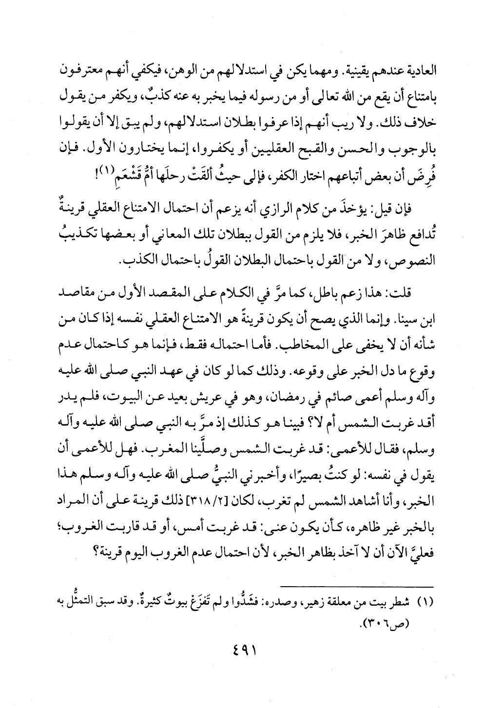 قلت: هذا زعم باطل، كما مرَّ في الكلام على المقصد الأول من مقاصد ابن سينا. وإنما الذي يصح أن يكون قرينةً هو الامتناع العقلي نفسه إذا كان من شأنه أن لا يخفى على المخاطب. فأما احتماله فقط، فإنما هو كاحتمال عدم وقوع ما دل الخبر على وقوعه. وذلك كما لو كان في عهد النبي صلى الله عليه وآله وسلم أعمى صائم في رمضان، وهو في عريش بعيد عن البيوت، فلم يدر أقد غربت الشمس أم لا؟ فبينا هو كذلك إذ مرَّ به النبي صلى الله عليه وآله وسلم، فقال للأعمى: قد غربت الشمس وصلَّينا المغرب. فهل للأعمى أن يقول في نفسه: لو كنتُ بصيرًا، وأخبرني النبيُّ صلى الله عليه وآله وسلم هذا الخبر، وأنا أشاهد الشمس لم تغرب، لكان [٢/ ٣١٨] ذلك قرينة على أن المراد بالخبر غير ظاهره، كأن يكون عنى: قد غربت أمس، أو قد قاربت الغروب؛ فعليَّ الآن أن لا آخذ بظاهر الخبر، لأن احتمال عدم الغروب اليوم قرينة؟