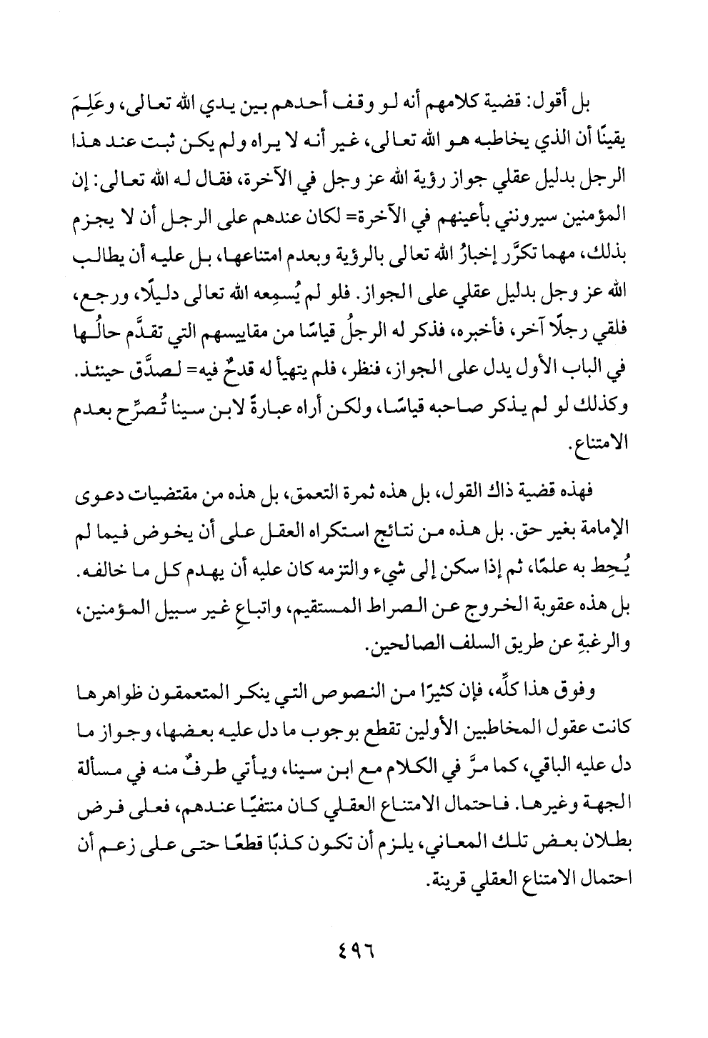 بل أقول: قضية كلامهم أنه لو وقف أحدهم بين يدي الله تعالى، وعَلِمَ يقينًا أن الذي يخاطبه هو الله تعالى، غير أنه لا يراه ولم يكن ثبت عند هذا الرجل بدليل عقلي جواز رؤية الله عز وجل في الآخرة، فقال له الله تعالى: إن المؤمنين سيرونني بأعينهم في الآخرة= لكان عندهم على الرجل أن لا يجزم بذلك، مهما تكرَّر إخبارُ الله تعالى بالرؤية وبعدم امتناعها، بل عليه أن يطالب الله عز وجل بدليل عقلي على الجواز. فلو لم يُسمِعه الله تعالى دليلًا، ورجع، فلقي رجلًا آخر، فأخبره، فذكر له الرجلُ قياسًا من مقاييسهم التي تقدَّم حالُها في الباب الأول يدل على الجواز، فنظر، فلم يتهيأ له قدحٌ فيه= لصدَّق حينئذ. وكذلك لو لم يذكر صاحبه قياسًا، ولكن أراه عبارةً لابن سينا تُصرِّح بعدم الامتناع.