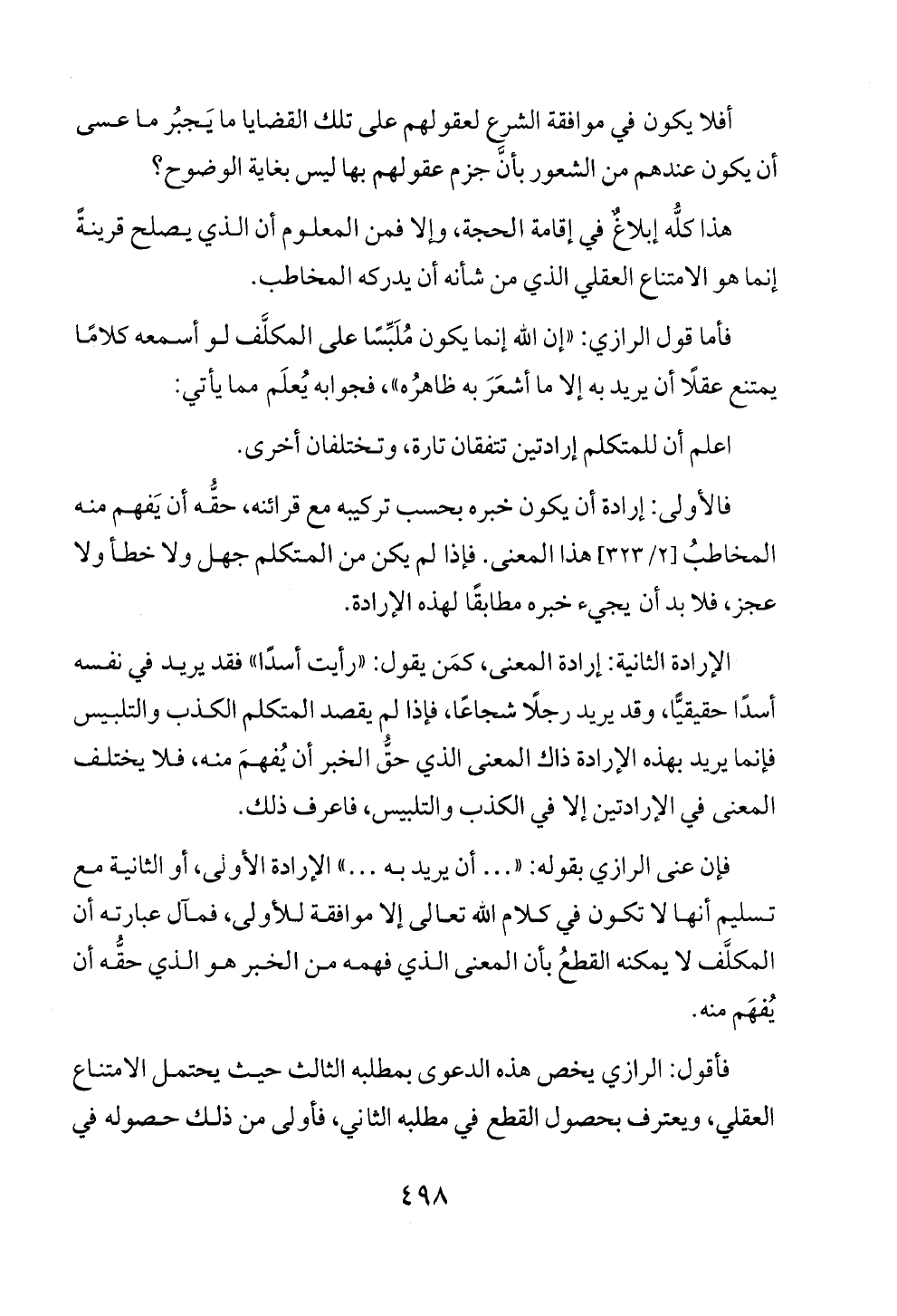 فإن عنى الرازي بقوله: « ... أن يريد به ... » الإرادة الأولى، أو الثانية مع تسليم أنها لا تكون في كلام الله تعالى إلا موافقة للأولى، فمآل عبارته أن المكلَّف لا يمكنه القطعُ بأن المعنى الذي فهمه من الخبر هو الذي حقُّه أن يُفهَم منه.
