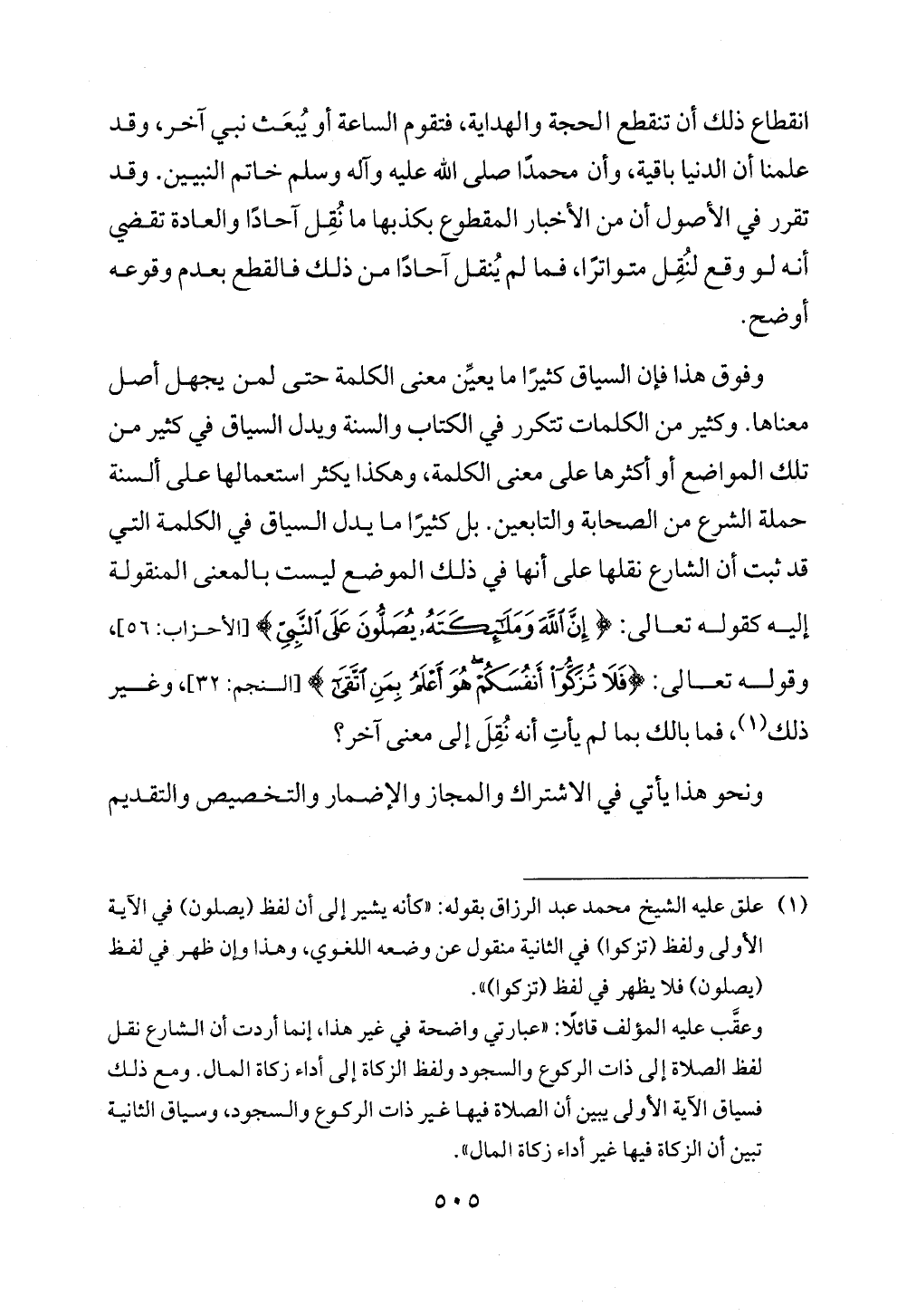 (¬١) علق عليه الشيخ محمد عبد الرزاق بقوله: «كأنه يشير إلى أن لفظ (يصلون) في الآية الأولى ولفظ (تزكوا) في الثانية منقول عن وضعه اللغوي، وهذا وإن ظهر في لفظ (يصلون) فلا يظهر في لفظ (تزكوا)».