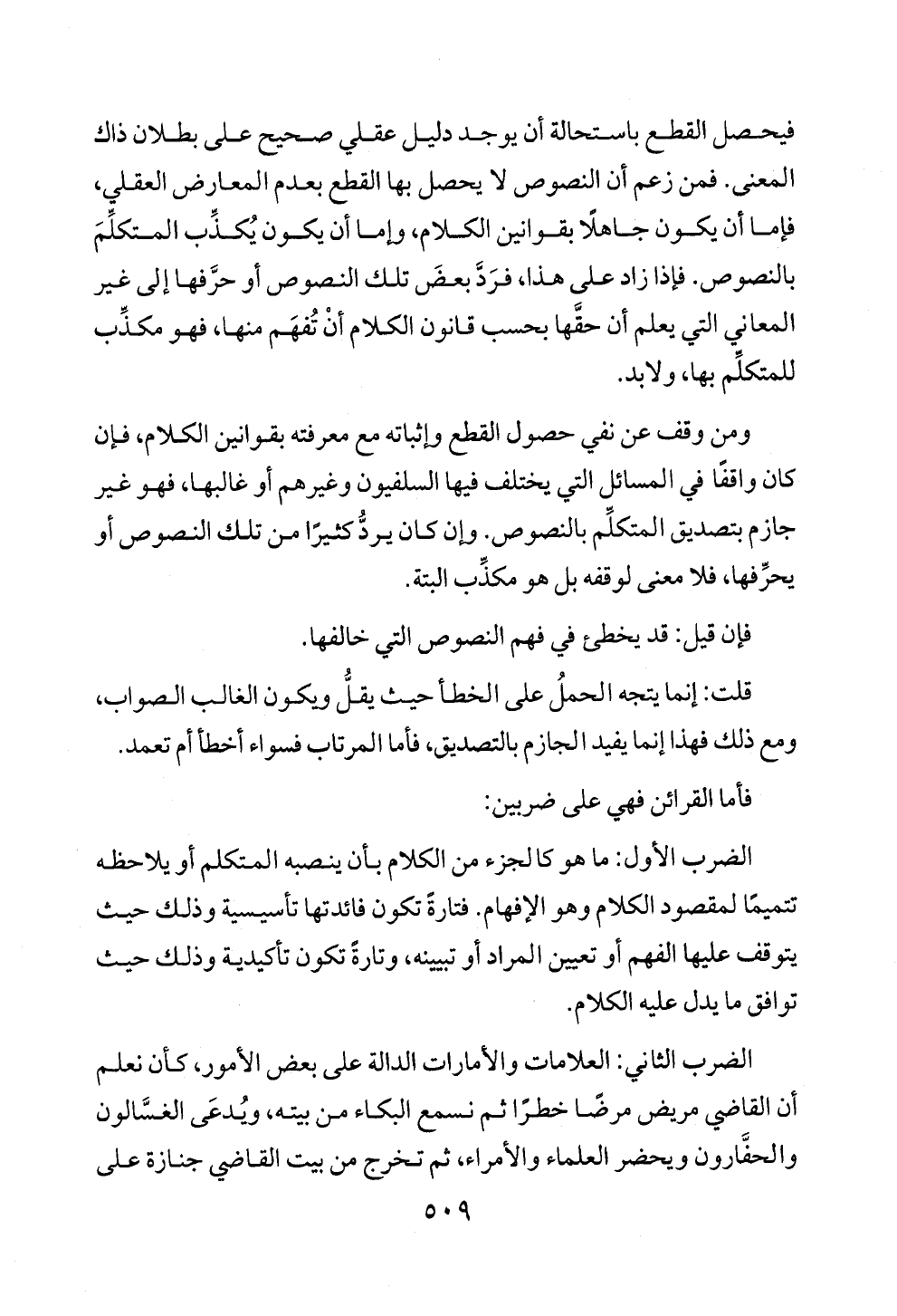 ومن وقف عن نفي حصول القطع وإثباته مع معرفته بقوانين الكلام، فإن كان واقفًا في المسائل التي يختلف فيها السلفيون وغيرهم أو غالبها، فهو غير جازم بتصديق المتكلِّم بالنصوص. وإن كان يردُّ كثيرًا من تلك النصوص أو يحرِّفها، فلا معنى لوقفه بل هو مكذِّب البتة.