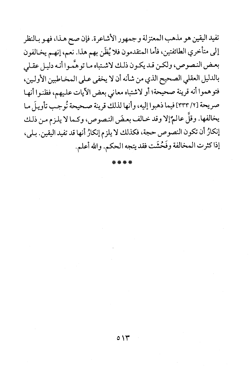 تفيد اليقين هو مذهب المعتزلة وجمهور الأشاعرة. فإن صح هذا، فهو بالنظر إلى متأخري الطائفتين، فأما المتقدمون فلا يُظَن بهم هذا. نعم، إنهم يخالفون بعض النصوص، ولكن قد يكون ذلك لاشتباه ما توهَّموا أنه دليل عقلي بالدليل العقلي الصحيح الذي من شأنه أن لا يخفى على المخاطبين الأولين، فتوهموا أنه قرينة صحيحة؛ أو لاشتباه معاني بعض الآيات عليهم، فظنوا أنها صريحة [٢/ ٣٣٣] فيما ذهبوا إليه، وأنها لذلك قرينة صحيحة تُوجب تأويلَ ما يخالفها. وقلَّ عالمٌ إلا وقد خالف بعضَ النصوص، وكما لا يلزم من ذلك إنكارُ أن تكون النصوص حجة، فكذلك لا يلزم إنكارُ أنها قد تفيد اليقين. بلى، إذا كثرت المخالفة وفَحُشَت فقد يتجه الحكم. والله أعلم.