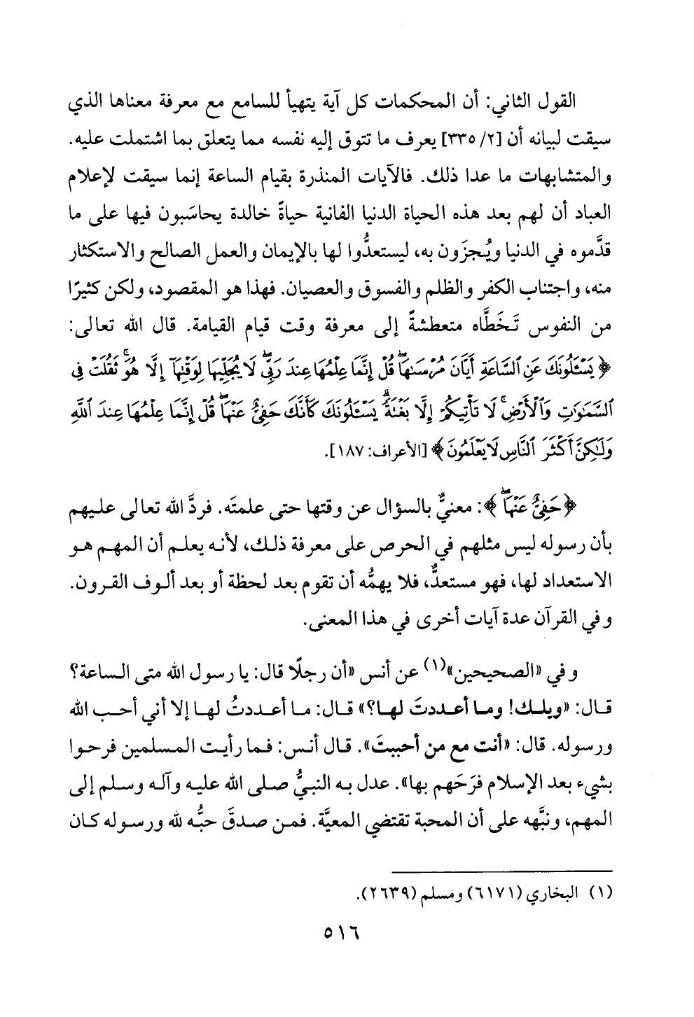 القول الثاني: أن المحكمات كل آية يتهيأ للسامع مع معرفة معناها الذي سيقت لبيانه أن [٢/ ٣٣٥] يعرف ما تتوق إليه نفسه مما يتعلق بما اشتملت عليه. والمتشابهات ما عدا ذلك. فالآيات المنذرة بقيام الساعة إنما سيقت لإعلام العباد أن لهم بعد هذه الحياة الدنيا الفانية حياةً خالدة يحاسَبون فيها على ما قدَّموه في الدنيا ويُجزَون به، ليستعدُّوا لها بالإيمان والعمل الصالح والاستكثار منه، واجتناب الكفر والظلم والفسوق والعصيان. فهذا هو المقصود، ولكن كثيرًا من النفوس تَخَطَّاه متعطشةً إلى معرفة وقت قيام القيامة. قال الله تعالى: {يَسْأَلُونَكَ عَنِ السَّاعَةِ أَيَّانَ مُرْسَاهَا قُلْ إِنَّمَا عِلْمُهَا عِنْدَ رَبِّي لَا يُجَلِّيهَا لِوَقْتِهَا إِلَّا هُوَ ثَقُلَتْ فِي السَّمَاوَاتِ وَالْأَرْضِ لَا تَأْتِيكُمْ إِلَّا بَغْتَةً يَسْأَلُونَكَ كَأَنَّكَ حَفِيٌّ عَنْهَا قُلْ إِنَّمَا عِلْمُهَا عِنْدَ اللَّهِ وَلَكِنَّ أَكْثَرَ النَّاسِ لَا يَعْلَمُونَ} [الأعراف: ١٨٧].