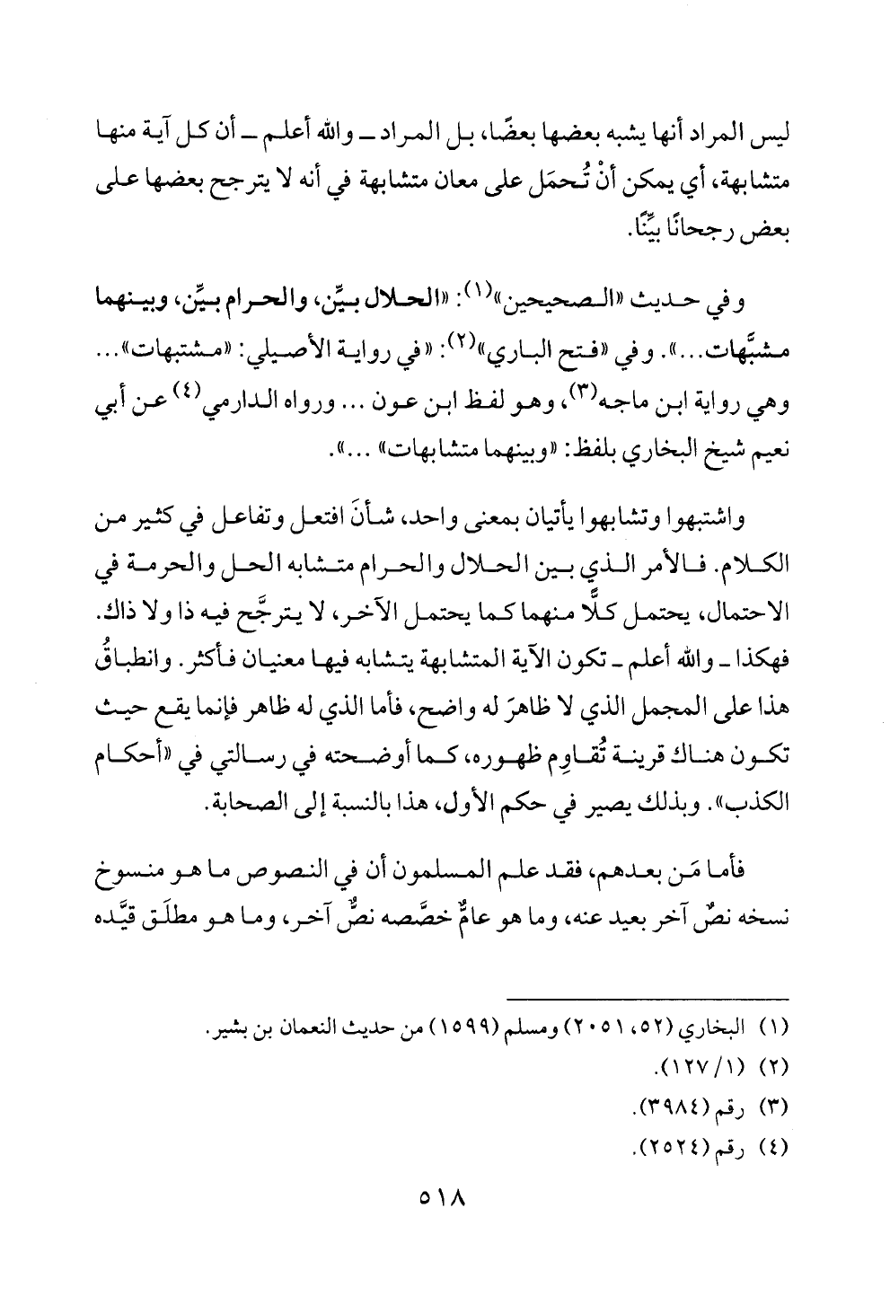 واشتبهوا وتشابهوا يأتيان بمعنى واحد، شأنَ افتعل وتفاعل في كثير من الكلام. فالأمر الذي بين الحلال والحرام متشابه الحل والحرمة في الاحتمال، يحتمل كلًّا منهما كما يحتمل الآخر، لا يترجَّح فيه ذا ولا ذاك. فهكذا ــ والله أعلم ــ تكون الآية المتشابهة يتشابه فيها معنيان فأكثر. وانطباقُ هذا على المجمل الذي لا ظاهرَ له واضح، فأما الذي له ظاهر فإنما يقع حيث تكون هناك قرينة تُقاوِم ظهوره، كما أوضحته في رسالتي في «أحكام الكذب». وبذلك يصير في حكم الأول، هذا بالنسبة إلى الصحابة.
