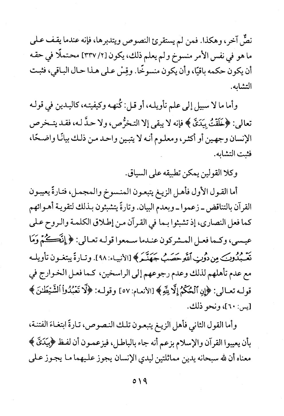أما القول الأول فأهل الزيغ يتبعون المنسوخ والمجمل، فتارةً يعيبون القرآن بالتناقض ــ زعموا ــ وبعدم البيان. وتارةً يتشبثون بذلك لتقوية أهوائهم كما فعل النصارى، إذ تشبثوا بما في القرآن من إطلاق الكلمة والروح على عيسى، وكما فعل المشركون عندما سمعوا قوله تعالى: {إِنَّكُمْ وَمَا تَعْبُدُونَ مِنْ دُونِ اللَّهِ حَصَبُ جَهَنَّمَ} [الأنبياء: ٩٨]. وتارةً يبتغون تأويله مع عدم تأهلهم لذلك وعدم رجوعهم إلى الراسخين، كما فعل الخوارج في قوله تعالى: {إِنِ الْحُكْمُ إِلَّا لِلَّهِ} [الأنعام: ٥٧] وقوله: {لَا تَعْبُدُوا الشَّيْطَانَ} [يس: ٦٠]، ونحو ذلك.