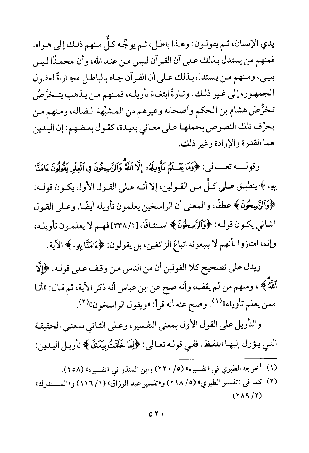والتأويل على القول الأول بمعنى التفسير، وعلى الثاني بمعنى الحقيقة التي يؤول إليها اللفظ. ففي قوله تعالى: {لِمَا خَلَقْتُ بِيَدَيَّ} تأويل اليدين: