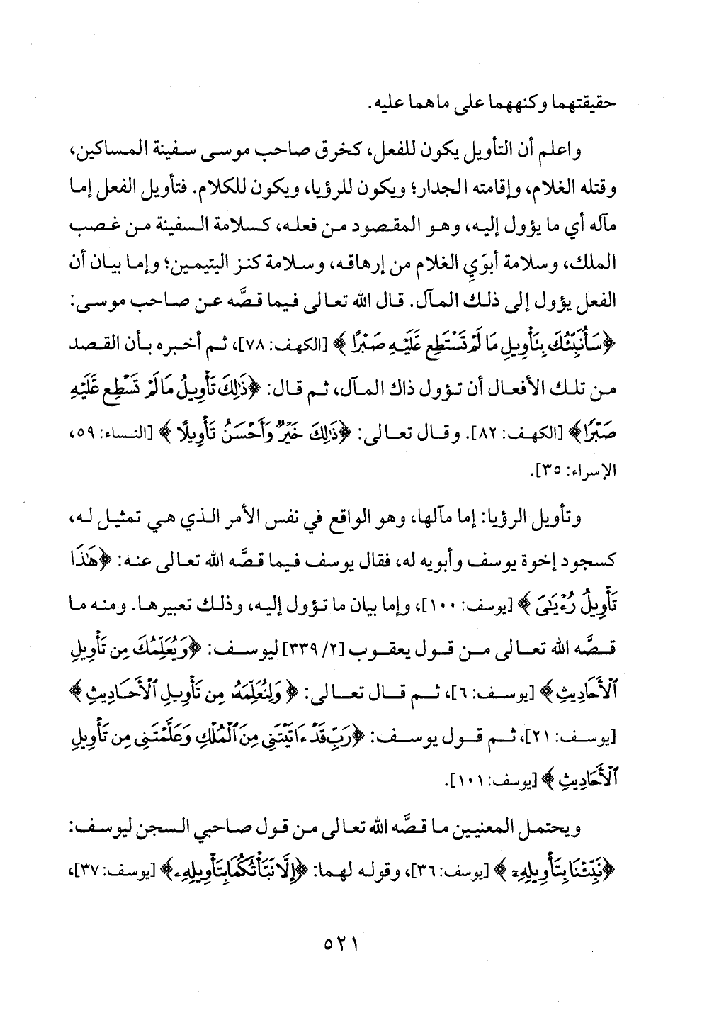 واعلم أن التأويل يكون للفعل، كخرق صاحب موسى سفينة المساكين، وقتله الغلام، وإقامته الجدار؛ ويكون للرؤيا، ويكون للكلام. فتأويل الفعل إما مآله أي ما يؤول إليه، وهو المقصود من فعله، كسلامة السفينة من غصب الملك، وسلامة أبوَيِ الغلام من إرهاقه، وسلامة كنز اليتيمين؛ وإما بيان أن الفعل يؤول إلى ذلك المآل. قال الله تعالى فيما قصَّه عن صاحب موسى: {سَأُنَبِّئُكَ بِتَأْوِيلِ مَا لَمْ تَسْتَطِعْ عَلَيْهِ صَبْرًا} [الكهف: ٧٨]، ثم أخبره بأن القصد من تلك الأفعال أن تؤول ذاك المآل، ثم قال: {ذَلِكَ تَأْوِيلُ مَا لَمْ تَسْطِعْ عَلَيْهِ صَبْرًا} [الكهف: ٨٢]. وقال تعالى: {ذَلِكَ خَيْرٌ وَأَحْسَنُ تَأْوِيلًا} [النساء: ٥٩، الإسراء: ٣٥].
