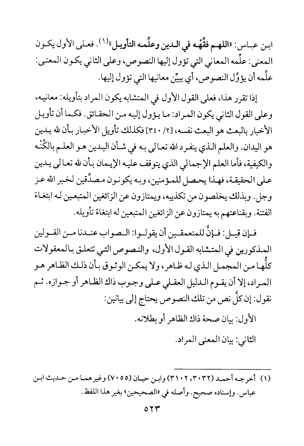 إذا تقرر هذا، فعلى القول الأول في المتشابه يكون المراد بتأويله: معانيه، وعلى القول الثاني يكون المراد: ما يؤول إليه من الحقائق. فكما أن تأويل الأخبار بالبعث هو البعث نفسه، [٢/ ٣٤٠] فكذلك تأويل الأخبار بأن لله يدين هو اليدان. والعلم الذي ينفرد الله تعالى به في شأن اليدين هو العلم بالكُنْه والكيفية، فأما العلم الإجمالي الذي يتوقف عليه الإيمان بأن لله تعالى يدين على الحقيقة، فهذا يحصل للمؤمنين، وبه يكونون مصدِّقين لخبر الله عز وجل. وبذلك يخلصون من تكذيبه، ويمتازون عن الزائغين المتبعين له ابتغاءَ الفتنة. وبقناعتهم به يمتازون عن الزائغين المتبعين له ابتغاءَ تأويله.