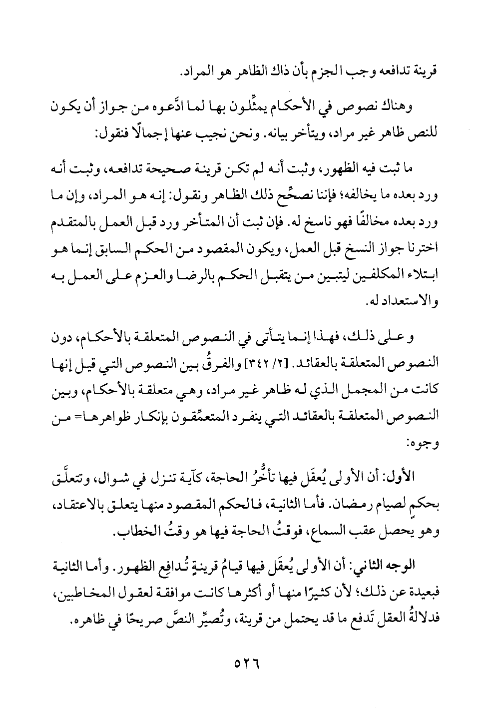 وعلى ذلك، فهذا إنما يتأتى في النصوص المتعلقة بالأحكام، دون النصوص المتعلقة بالعقائد. [٢/ ٣٤٢] والفرقُ بين النصوص التي قيل إنها كانت من المجمل الذي له ظاهر غير مراد، وهي متعلقة بالأحكام، وبين النصوص المتعلقة بالعقائد التي ينفرد المتعمِّقون بإنكار ظواهرها= من وجوه: