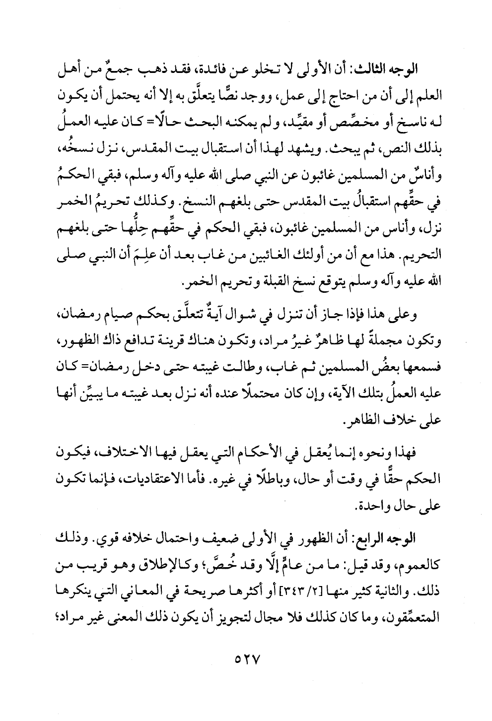 الوجه الثالث: أن الأولى لا تخلو عن فائدة، فقد ذهب جمعٌ من أهل العلم إلى أن من احتاج إلى عمل، ووجد نصًّا يتعلَّق به إلا أنه يحتمل أن يكون له ناسخ أو مخصِّص أو مقيِّد، ولم يمكنه البحث حالًا= كان عليه العملُ بذلك النص، ثم يبحث. ويشهد لهذا أن استقبال بيت المقدس، نزل نسخُه، وأناسٌ من المسلمين غائبون عن النبي صلى الله عليه وآله وسلم، فبقي الحكمُ في حقِّهم استقبالُ بيت المقدس حتى بلغهم النسخ. وكذلك تحريمُ الخمر نزل، وأناس من المسلمين غائبون، فبقي الحكم في حقِّهم حِلُّها حتى بلغهم التحريم. هذا مع أن من أولئك الغائبين من غاب بعد أن علِمَ أن النبي صلى الله عليه وآله وسلم يتوقع نسخ القبلة وتحريم الخمر.