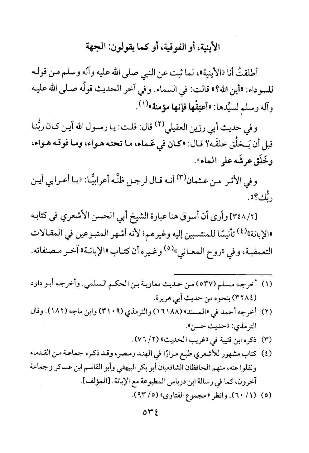 أطلقتُ أنا «الأينية»، لما ثبت عن النبي صلى الله عليه وآله وسلم من قوله للسوداء: «أين الله؟» قالت: في السماء. وفي آخر الحديث قولُه صلى الله عليه وآله وسلم لسيِّدها: «أعتِقْها فإنها مؤمنة» (¬١).