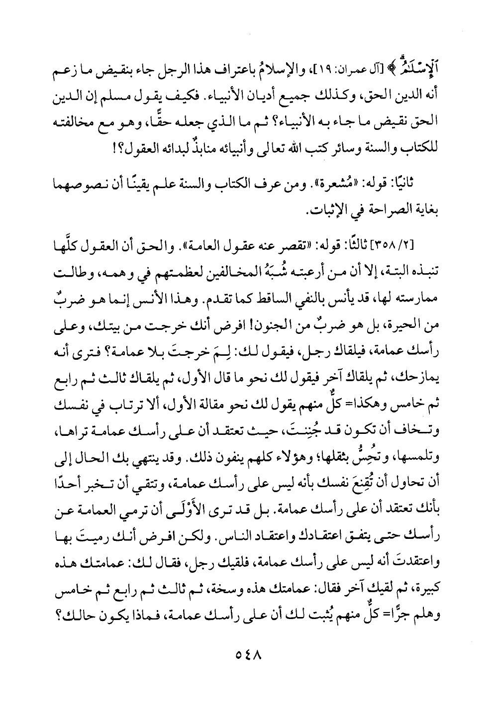 [٢/ ٣٥٨] ثالثًا: قوله: «تقصر عنه عقول العامة». والحق أن العقول كلَّها تنبذه البتة، إلا أن من أرعبته شُبَهُ المخالفين لعظمتهم في وهمه، وطالت ممارسته لها، قد يأنس بالنفي الساقط كما تقدم. وهذا الأنس إنما هو ضربٌ من الحيرة، بل هو ضربٌ من الجنون! افرض أنك خرجت من بيتك، وعلى رأسك عمامة، فيلقاك رجل، فيقول لك: لِمَ خرجتَ بلا عمامة؟ فترى أنه يمازحك، ثم يلقاك آخر فيقول لك نحو ما قال الأول، ثم يلقاك ثالث ثم رابع ثم خامس وهكذا= كلٌّ منهم يقول لك نحو مقالة الأول، ألا ترتاب في نفسك وتخاف أن تكون قد جُنِنتَ، حيث تعتقد أن على رأسك عمامة تراها، وتلمسها، وتُحِسُّ بثقلها؛ وهؤلاء كلهم ينفون ذلك. وقد ينتهي بك الحال إلى أن تحاول أن تُقِنعَ نفسك بأنه ليس على رأسك عمامة، وتتقي أن تخبر أحدًا بأنك تعتقد أن على رأسك عمامة. بل قد ترى الأَوْلَى أن ترمي العمامة عن رأسك حتى يتفق اعتقادك واعتقاد الناس. ولكن افرض أنك رميتَ بها واعتقدتَ أنه ليس على رأسك عمامة، فلقيك رجل، فقال لك: عمامتك هذه كبيرة، ثم لقيك آخر فقال: عمامتك هذه وسخة، ثم ثالث ثم رابع ثم خامس وهلم جرًّا= كلٌّ منهم يُثبت لك أن على رأسك عمامة، فماذا يكون حالك؟
