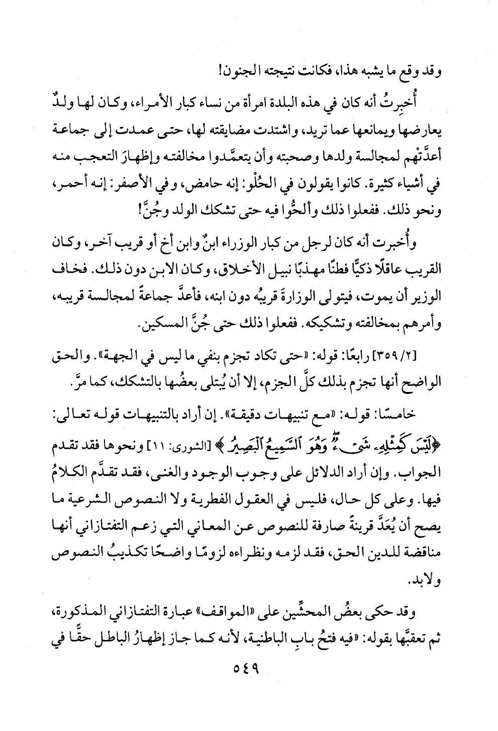 خامسًا: قوله: «مع تنبيهات دقيقة». إن أراد بالتنبيهات قوله تعالى: {لَيْسَ كَمِثْلِهِ شَيْءٌ وَهُوَ السَّمِيعُ الْبَصِيرُ} [الشورى: ١١] ونحوها فقد تقدم الجواب. وإن أراد الدلائل على وجوب الوجود والغنى، فقد تقدَّم الكلامُ فيها. وعلى كل حال، فليس في العقول الفطرية ولا النصوص الشرعية ما يصح أن يُعَدَّ قرينةً صارفة للنصوص عن المعاني التي زعم التفتازاني أنها مناقضة للدين الحق، فقد لزمه ونظراءه لزومًا واضحًا تكذيبُ النصوص ولابد.