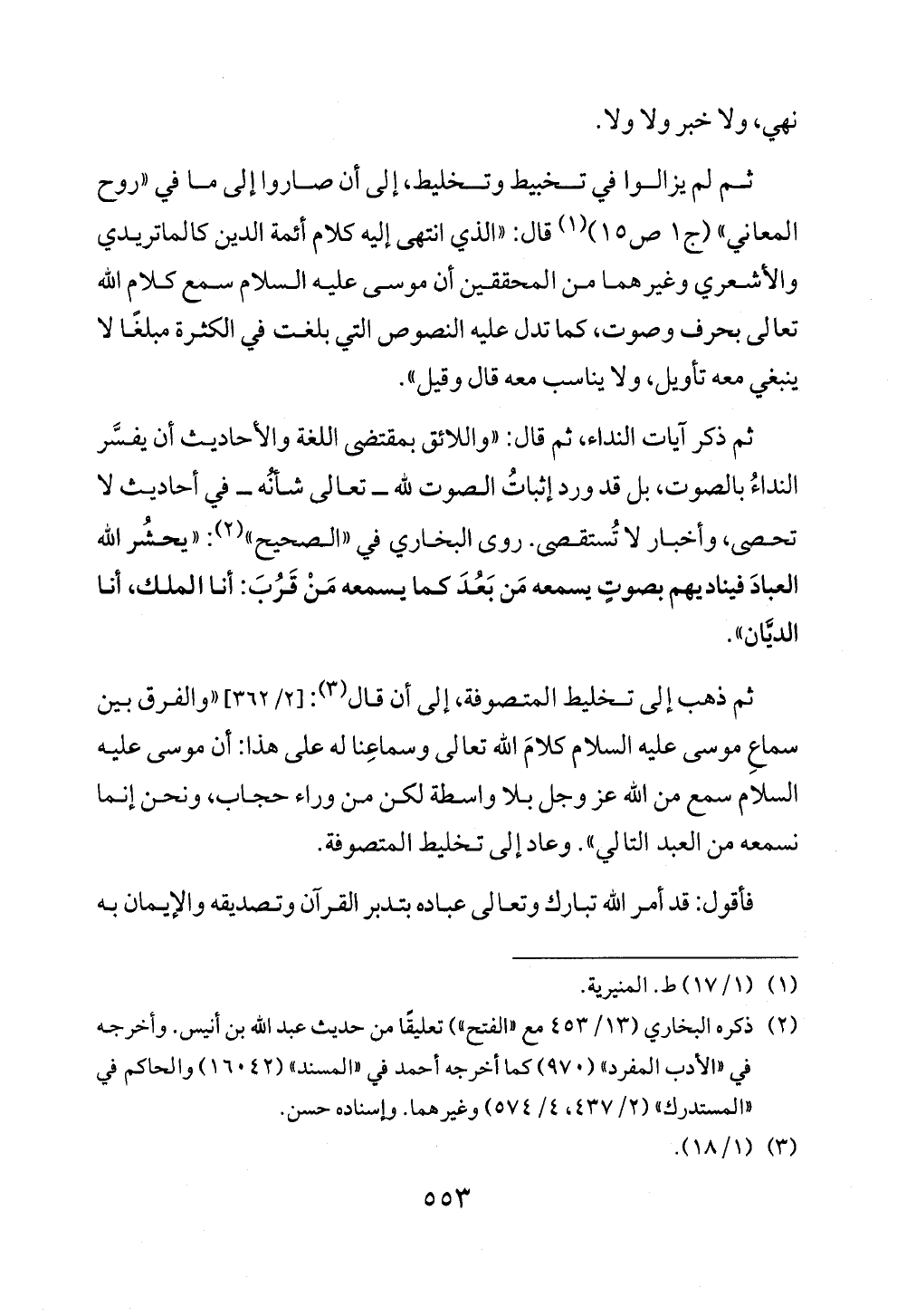 ثم ذهب إلى تخليط المتصوفة، إلى أن قال (¬٣): [٢/ ٣٦٢] «والفرق بين سماعِ موسى عليه السلام كلامَ الله تعالى وسماعِنا له على هذا: أن موسى عليه السلام سمع من الله عز وجل بلا واسطة لكن من وراء حجاب، ونحن إنما نسمعه من العبد التالي». وعاد إلى تخليط المتصوفة.