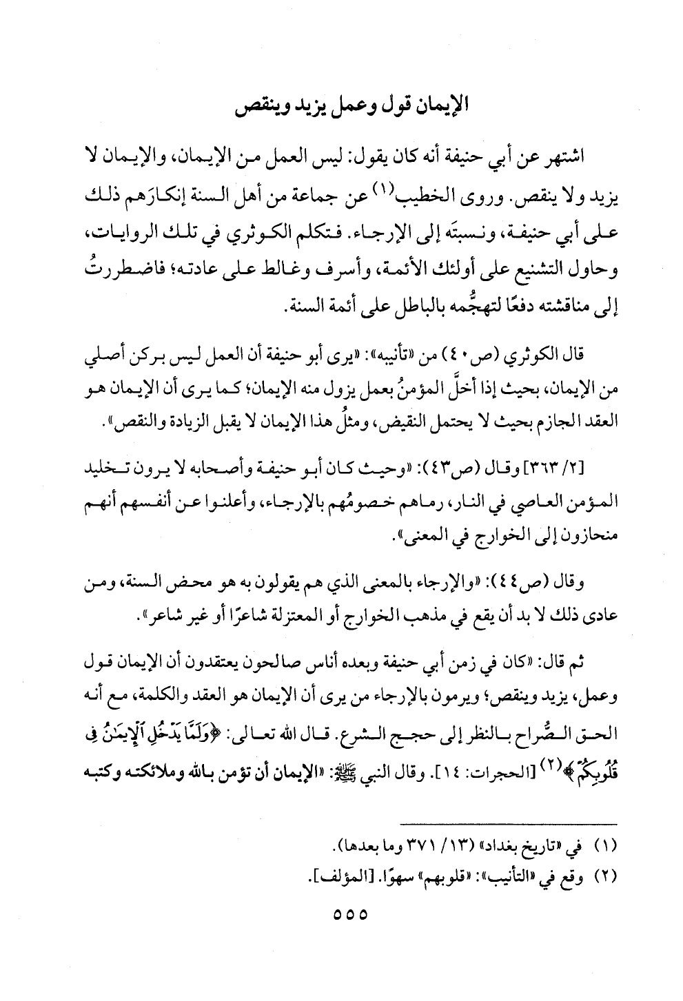 [٢/ ٣٦٣] وقال (ص ٤٣): «وحيث كان أبو حنيفة وأصحابه لا يرون تخليد المؤمن العاصي في النار، رماهم خصومُهم بالإرجاء، وأعلنوا عن أنفسهم أنهم منحازون إلى الخوارج في المعنى».