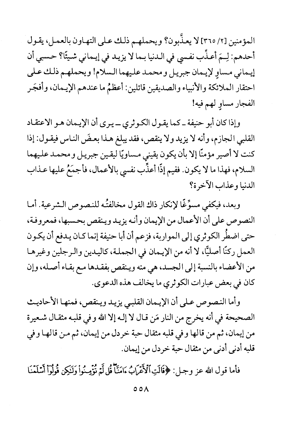 وبعد، فيكفي مسوِّغًا لإنكار ذاك القول مخالفتُه للنصوص الشرعية. أما النصوص على أن الأعمال من الإيمان وأنه يزيد وينقص بحسبها، فمعروفة، حتى اضطُر الكوثري إلى المواربة، فزعم أن أبا حنيفة إنما كان يدفع أن يكون العمل ركنًا أصليًّا، لا أنه من الإيمان في الجملة، كاليدين والرجلين وغيرها من الأعضاء بالنسبة إلى الجسد، هي منه وينقص بفقدها مع بقاء أصله، وإن كان في بعض عبارات الكوثري ما يخالف هذه الدعوى.