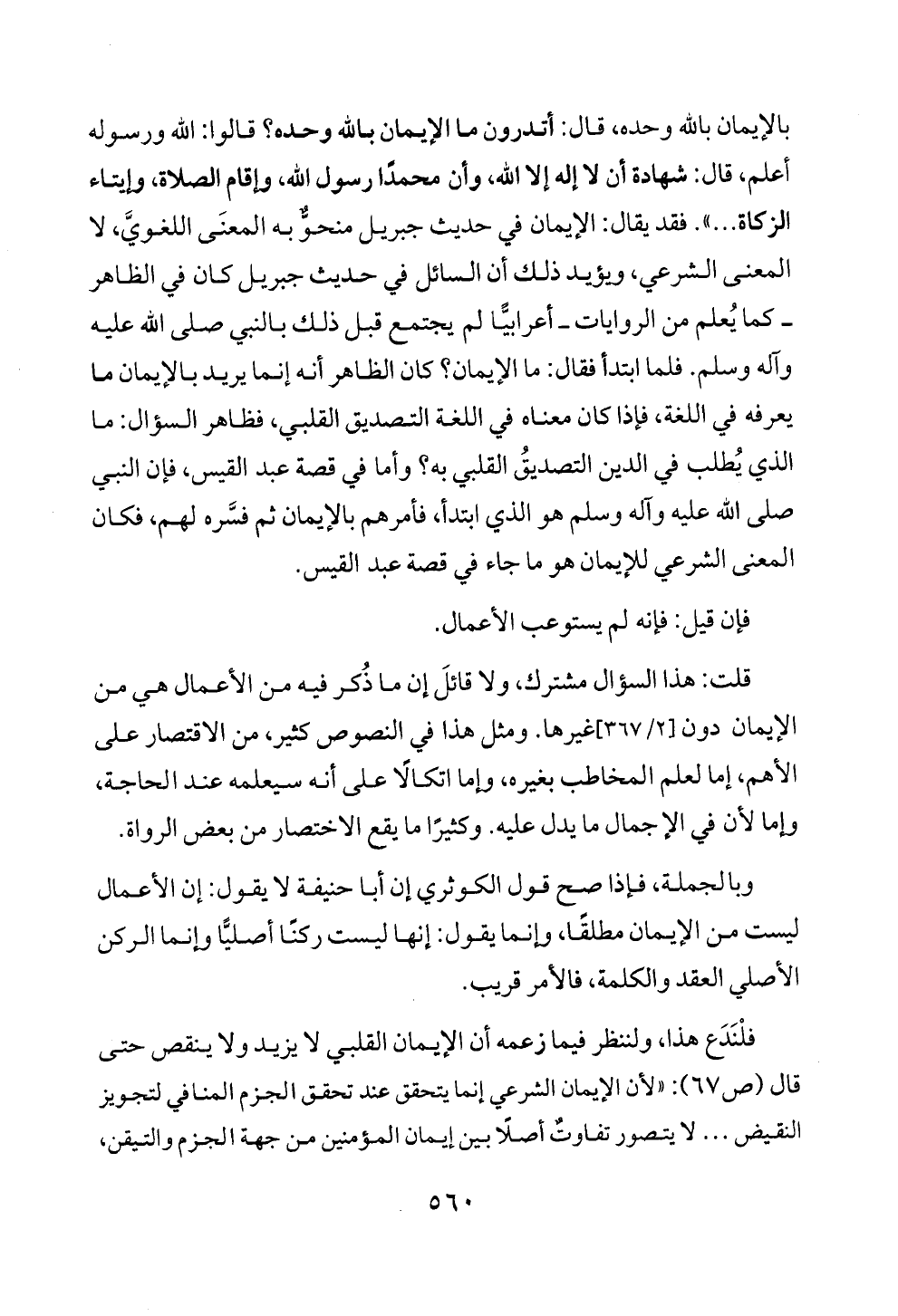 فلْنَدَع هذا، ولننظر فيما زعمه أن الإيمان القلبي لا يزيد ولا ينقص حتى قال (ص ٦٧): «لأن الإيمان الشرعي إنما يتحقق عند تحقق الجزم المنافي لتجويز النقيض ... لا يتصور تفاوتٌ أصلًا بين إيمان المؤمنين من جهة الجزم والتيقن،