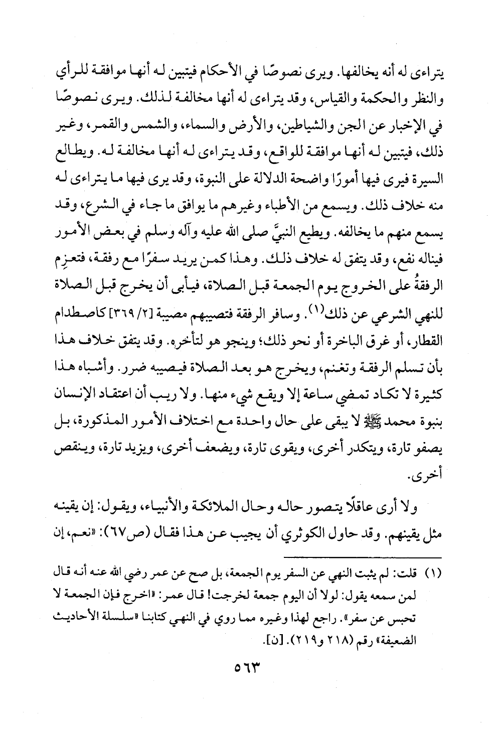 يتراءى له أنه يخالفها. ويرى نصوصًا في الأحكام فيتبين له أنها موافقة للرأي والنظر والحكمة والقياس، وقد يتراءى له أنها مخالفة لذلك. ويرى نصوصًا في الإخبار عن الجن والشياطين، والأرض والسماء، والشمس والقمر، وغير ذلك، فيتبين له أنها موافقة للواقع، وقد يتراءى له أنها مخالفة له. ويطالع السيرة فيرى فيها أمورًا واضحة الدلالة على النبوة، وقد يرى فيها ما يتراءى له منه خلاف ذلك. ويسمع من الأطباء وغيرهم ما يوافق ما جاء في الشرع، وقد يسمع منهم ما يخالفه. ويطيع النبيَّ صلى الله عليه وآله وسلم في بعض الأمور فيناله نفع، وقد يتفق له خلاف ذلك. وهذا كمن يريد سفرًا مع رفقة، فتعزِم الرفقةُ على الخروج يوم الجمعة قبل الصلاة، فيأبى أن يخرج قبل الصلاة للنهي الشرعي عن ذلك (¬١). وسافر الرفقة فتصيبهم مصيبة [٢/ ٣٦٩] كاصطدام القطار، أو غرق الباخرة أو نحو ذلك؛ وينجو هو لتأخره. وقد يتفق خلاف هذا بأن تسلم الرفقة وتغنم، ويخرج هو بعد الصلاة فيصيبه ضرر. وأشباه هذا كثيرة لا تكاد تمضي ساعة إلا ويقع شيء منها. ولا ريب أن اعتقاد الإنسان بنبوة محمد - صلى الله عليه وسلم - لا يبقى على حال واحدة مع اختلاف الأمور المذكورة، بل يصفو تارة، ويتكدر أخرى، ويقوى تارة، ويضعف أخرى، ويزيد تارة، وينقص أخرى.