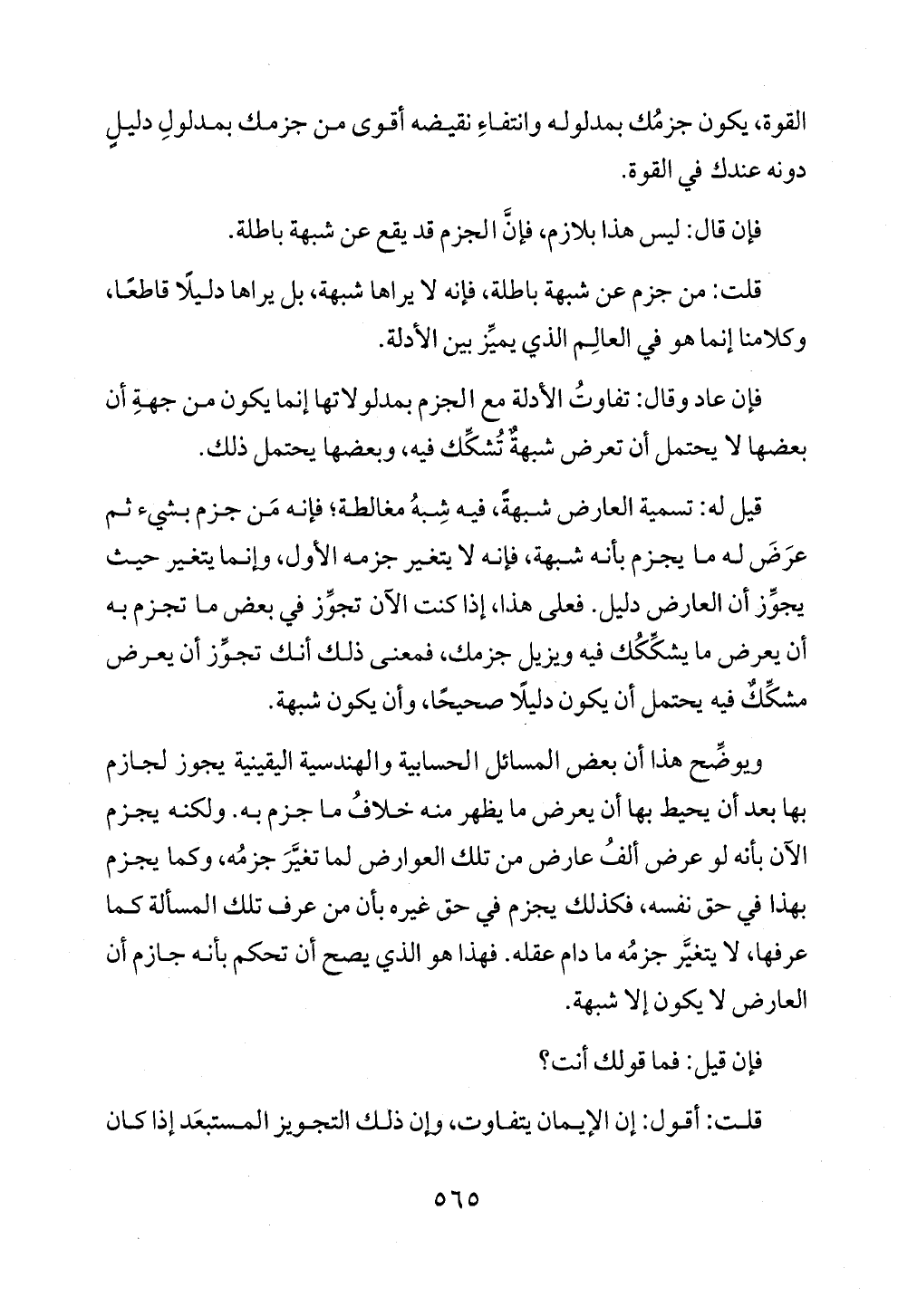 قيل له: تسمية العارض شبهةً، فيه شِبهُ مغالطة؛ فإنه مَن جزم بشيء ثم عرَضَ له ما يجزم بأنه شبهة، فإنه لا يتغير جزمه الأول، وإنما يتغير حيث يجوِّز أن العارض دليل. فعلى هذا، إذا كنت الآن تجوِّز في بعض ما تجزم به أن يعرض ما يشكِّكُك فيه ويزيل جزمك، فمعنى ذلك أنك تجوِّز أن يعرض مشكِّكٌ فيه يحتمل أن يكون دليلًا صحيحًا، وأن يكون شبهة.