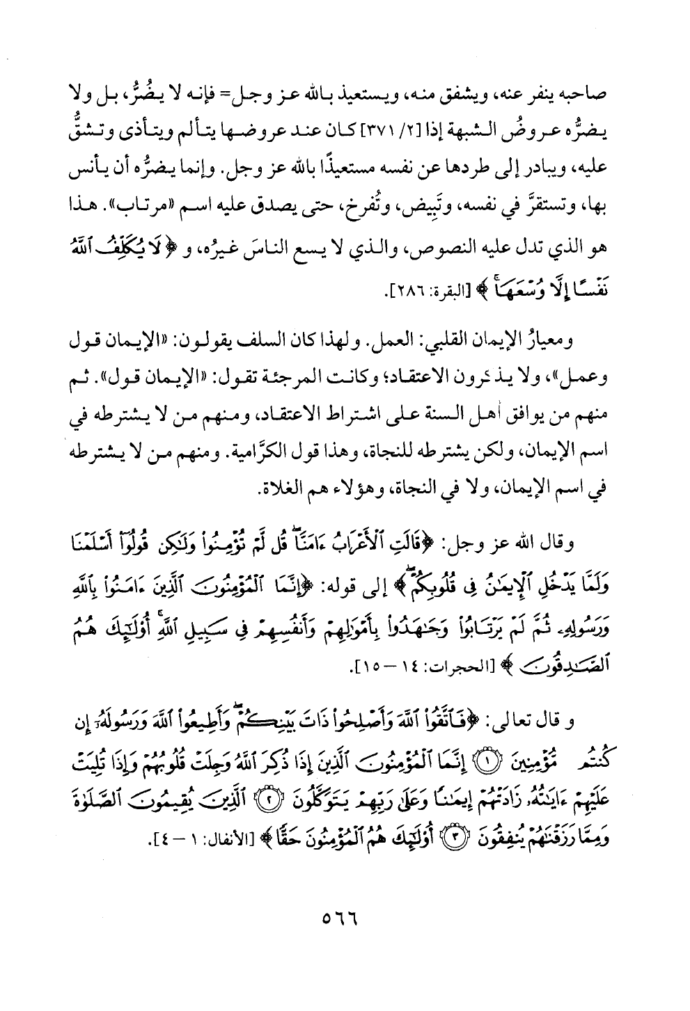 صاحبه ينفر عنه، ويشفق منه، ويستعيذ بالله عز وجل= فإنه لا يضُرُّ، بل ولا يضرُّه عروضُ الشبهة إذا [٢/ ٣٧١] كان عند عروضها يتألم ويتأذى وتشقُّ عليه، ويبادر إلى طردها عن نفسه مستعيذًا بالله عز وجل. وإنما يضرُّه أن يأنس بها، وتستقرَّ في نفسه، وتَبِيض، وتُفرخ، حتى يصدق عليه اسم «مرتاب». هذا هو الذي تدل عليه النصوص، والذي لا يسع الناسَ غيرُه، و {لَا يُكَلِّفُ اللَّهُ نَفْسًا إِلَّا وُسْعَهَا} [البقرة: ٢٨٦].